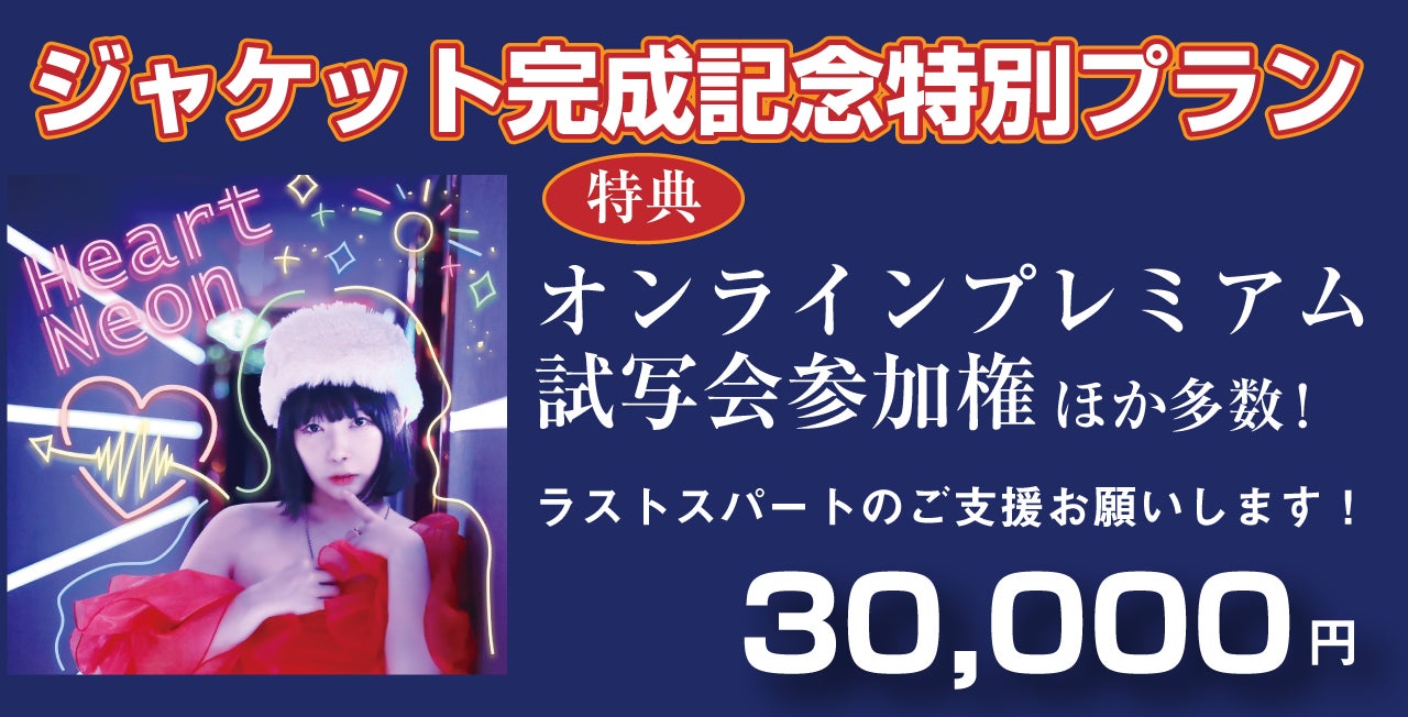 オンラインプレミアム試写会参加権プランを設定いたしました!! 完成したミュージックビデオを一般公開に先駆けてご覧いただける、オンラインプレミアム試写会にご招待いたします。 オンラインプレミアム試写会特設サイトへは、ご支援者様にお送りをさせていただきます専用IDとパスワードでアクセスいただけます。 また、スペシャル特典として、スチール撮影時のジャケット写真のデジタルデータをダウンロードいただけます。
