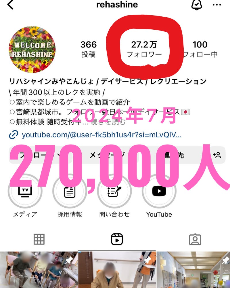 私たちは宮崎県都城市にあるデイサービス「リハシャインみやこんじょ」です。私たちは年間300以上のレクリエーションを実施しています。その様子をInstagramの動画で紹介しており現在フォロワー数27万人超えです。