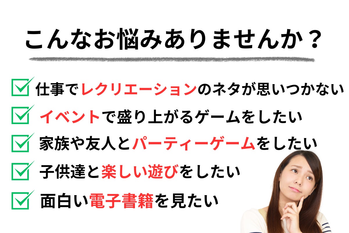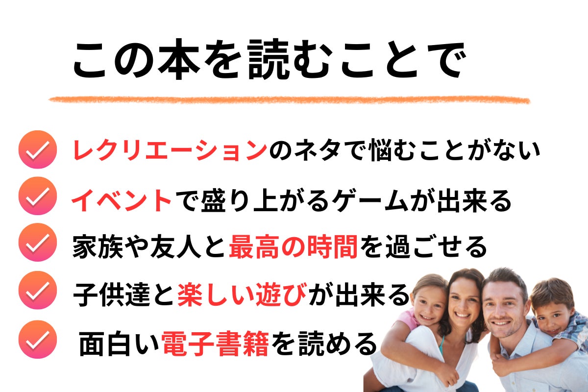 この本を見ることで家族や友人と一緒に笑顔で楽しい時間を過ごすことができます。どなたでも楽しめる内容となっていますので、家族や友人とのパーティーや集まりのときにみんなでゲームして盛り上がること間違いなしです。