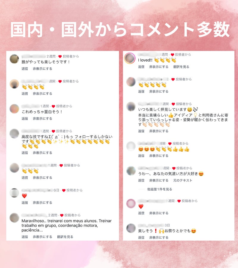 このレクリエーションゲームを見た国内・海外の方々から嬉しいコメントが毎日たくさん届きます。「参考になる」「これはみんなが楽しめるゲームだ」「いつも楽しみにしています」とコメントを頂き、私達もとても嬉しく思っています。