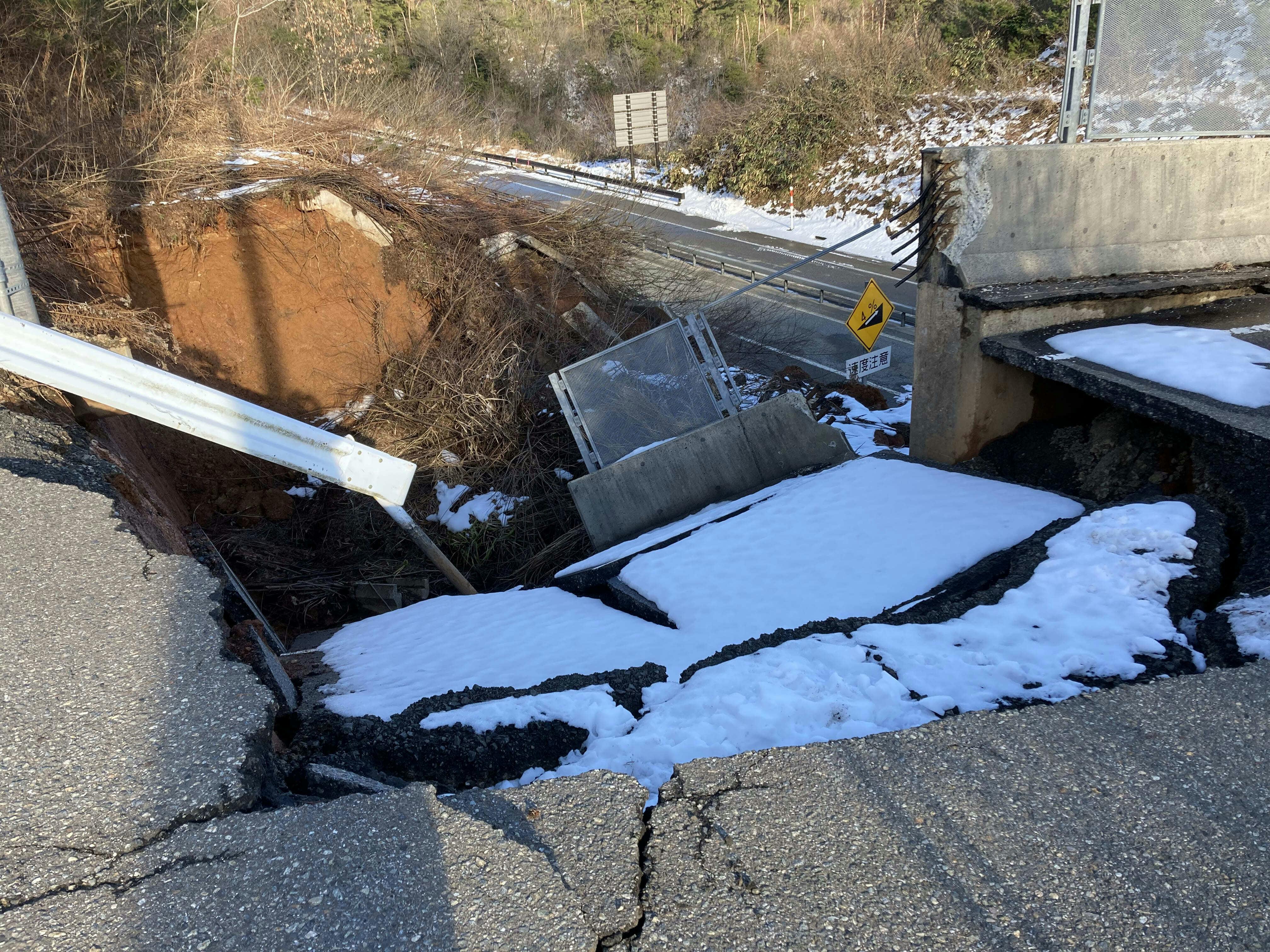 進入道路には雪が降り積もっており、高架橋も一部が崩れ、車ではゴルフ場まで向かえず、約2kmの雪道を歩いて現地点検に向かいました。