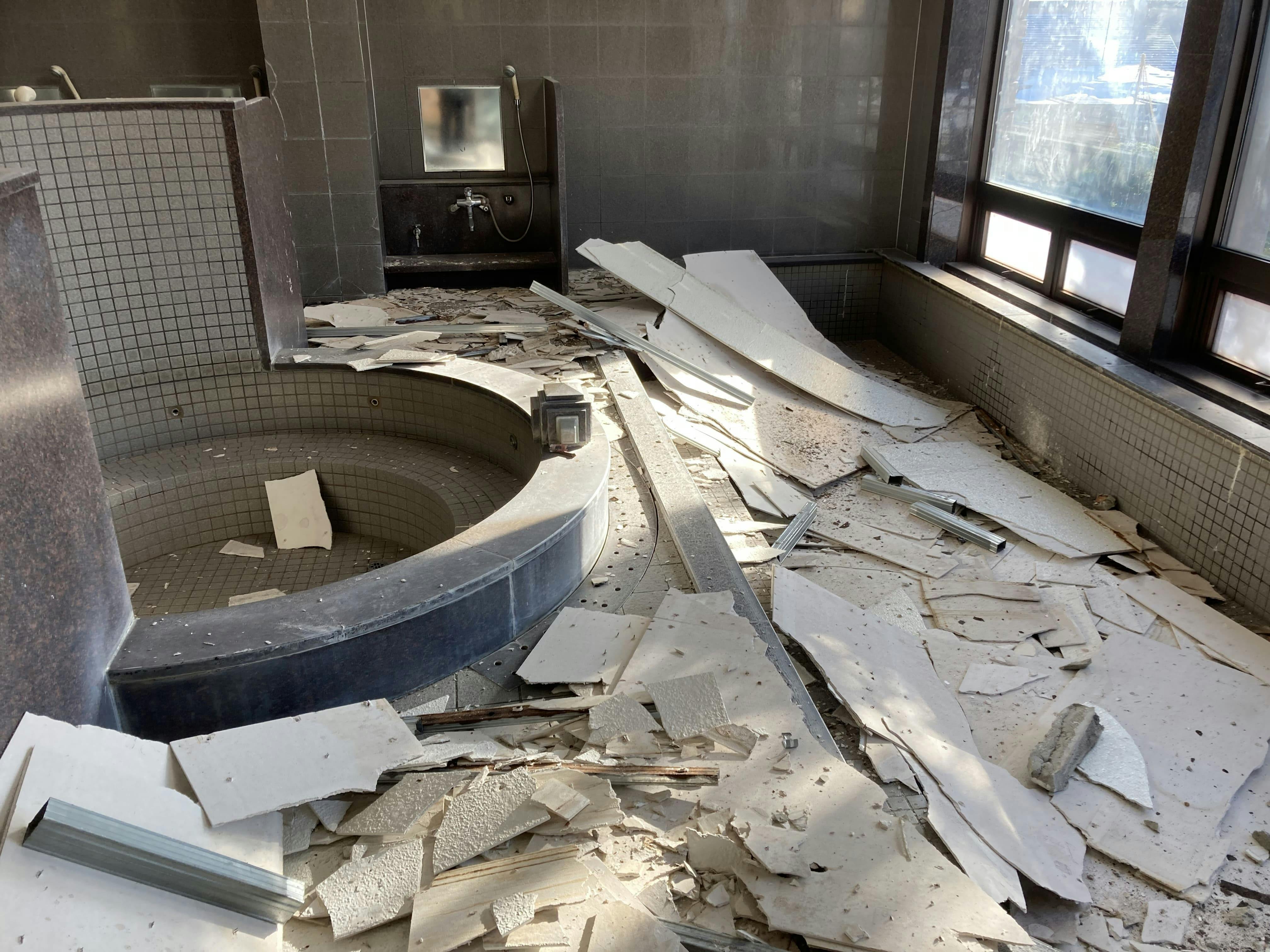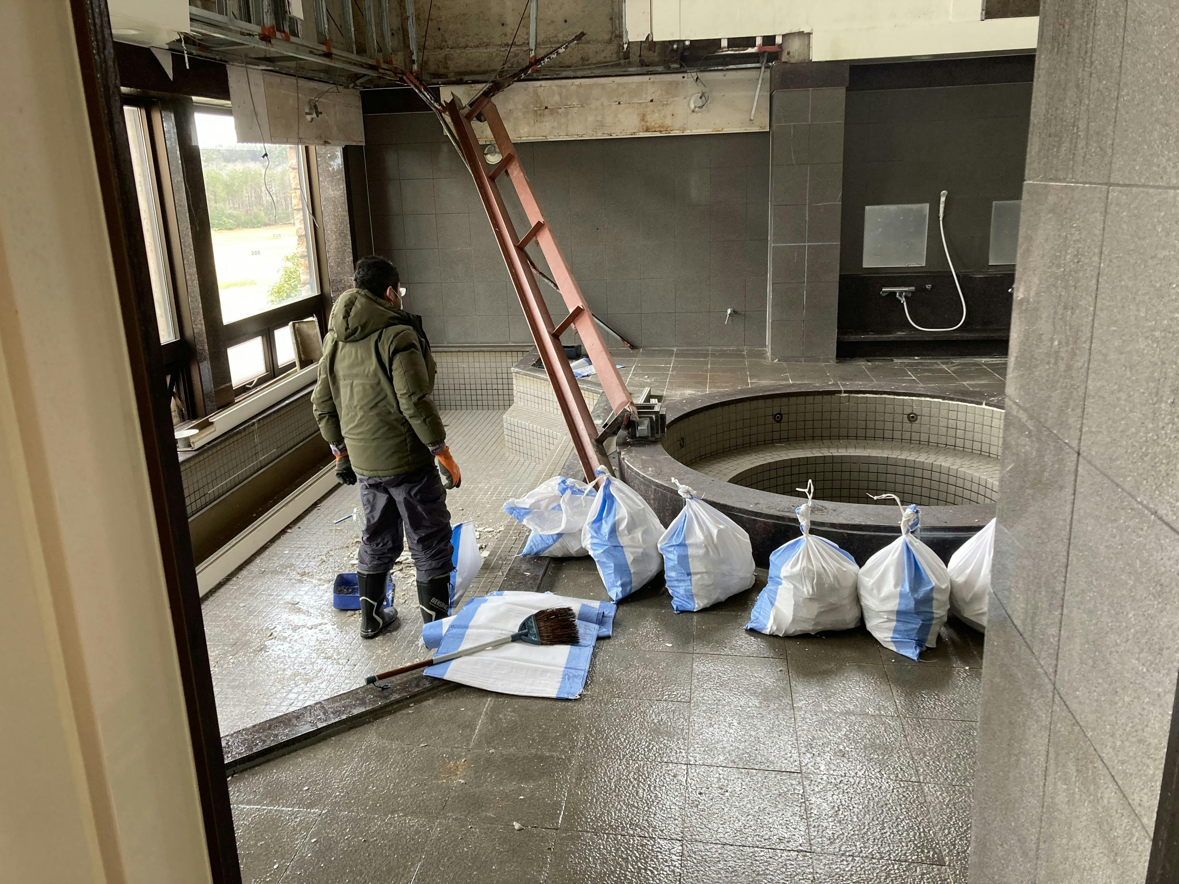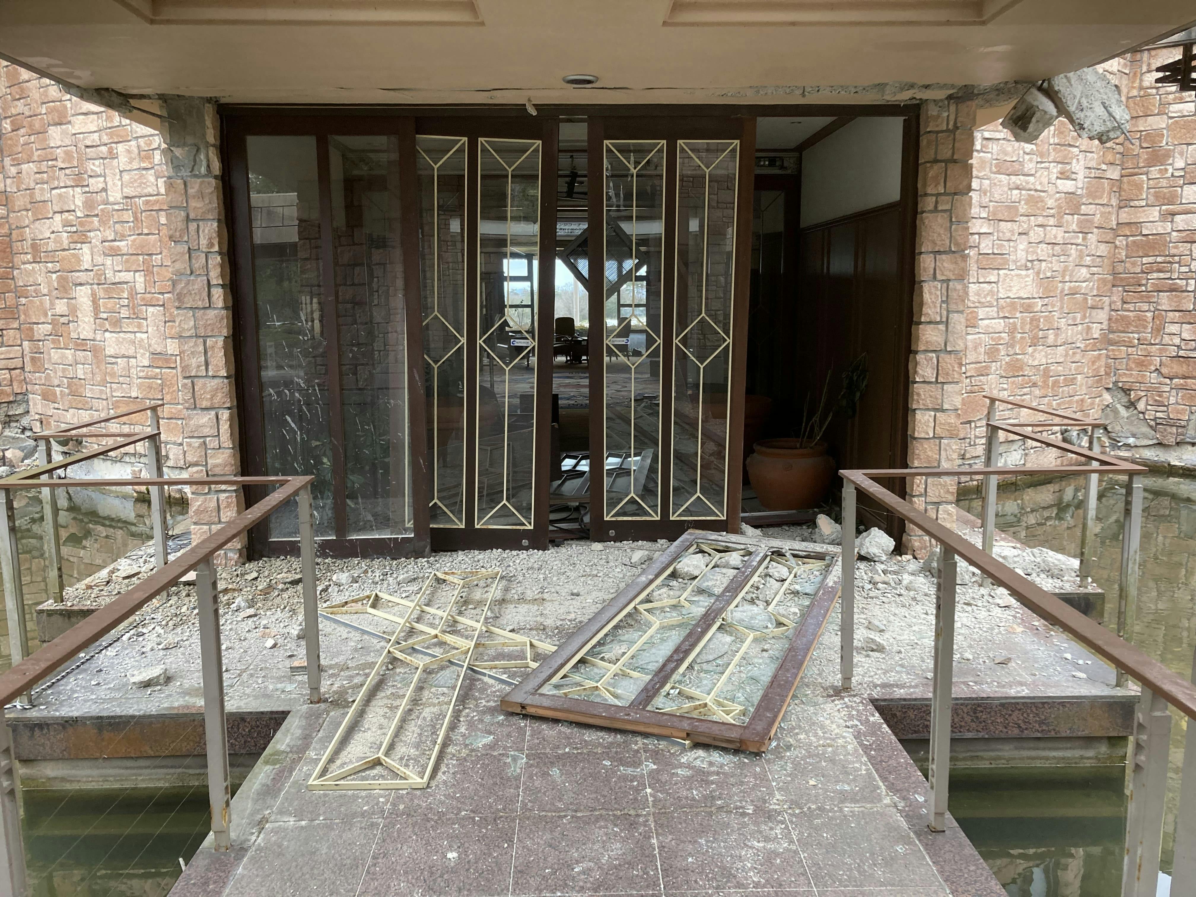 クラブハウスは大規模半壊。自動ドアが外れ、窓ガラスが割れ、外壁が崩れ落ち、ロッカーや浴室にも甚大な被害が出ていました。