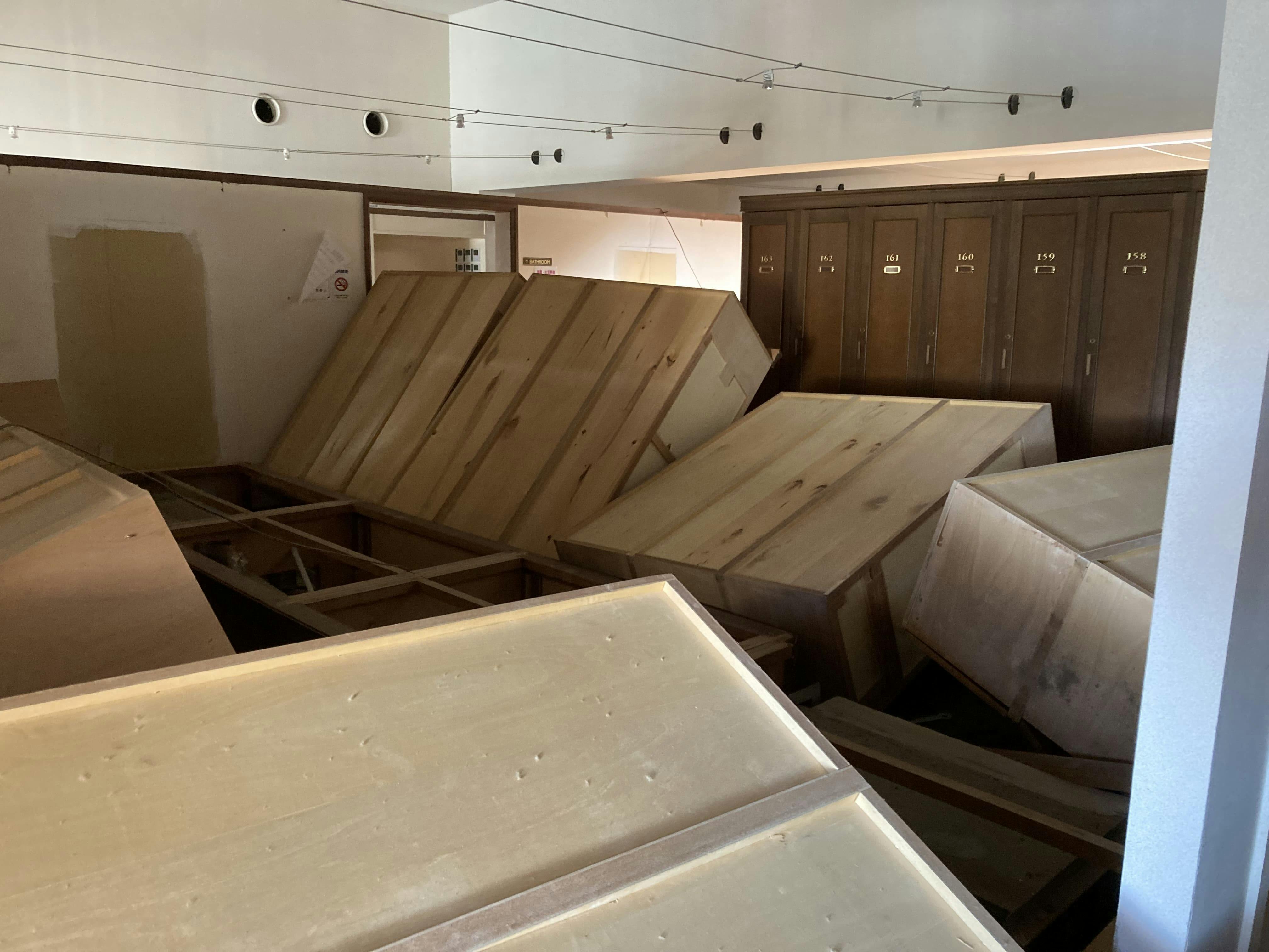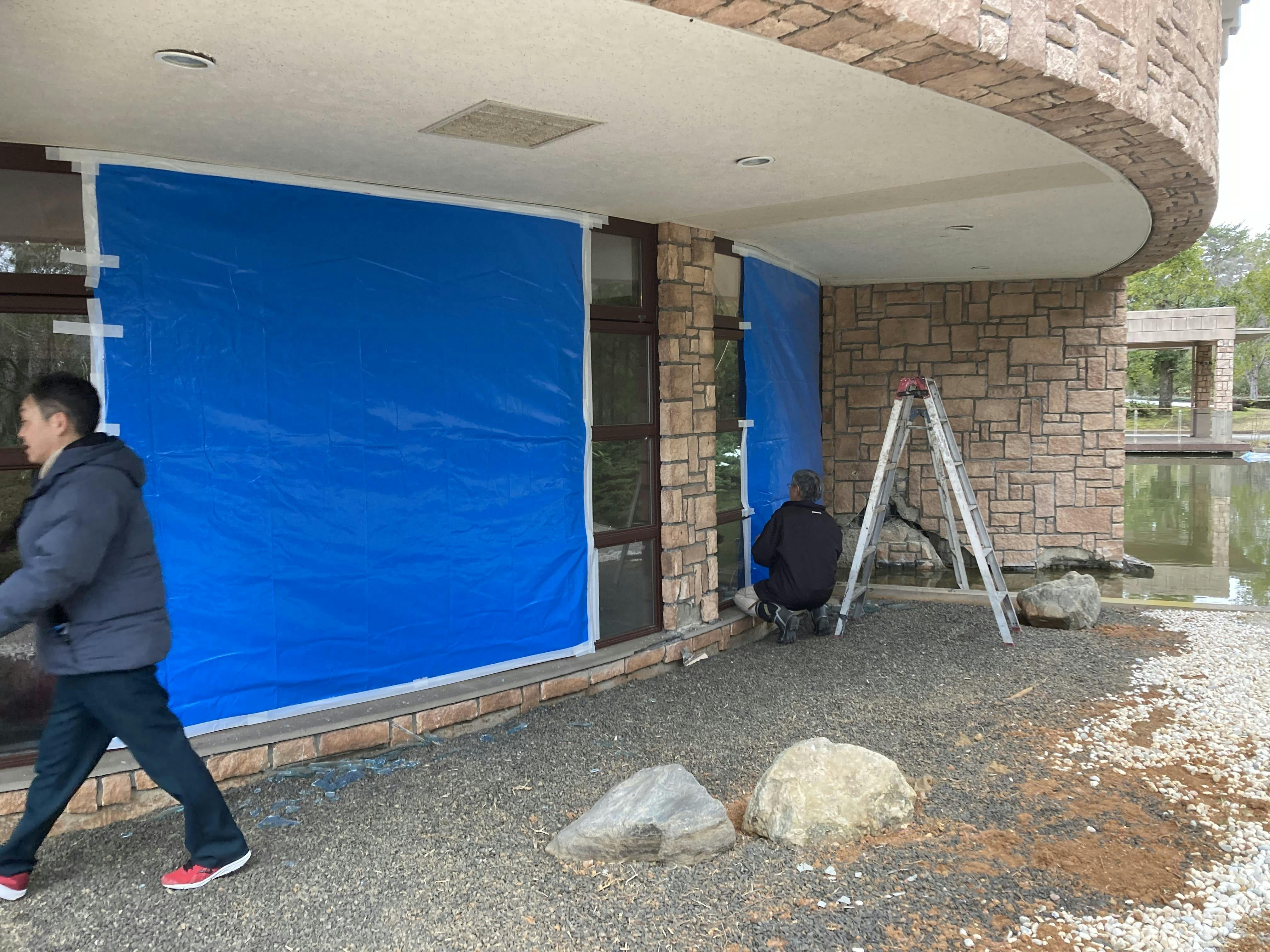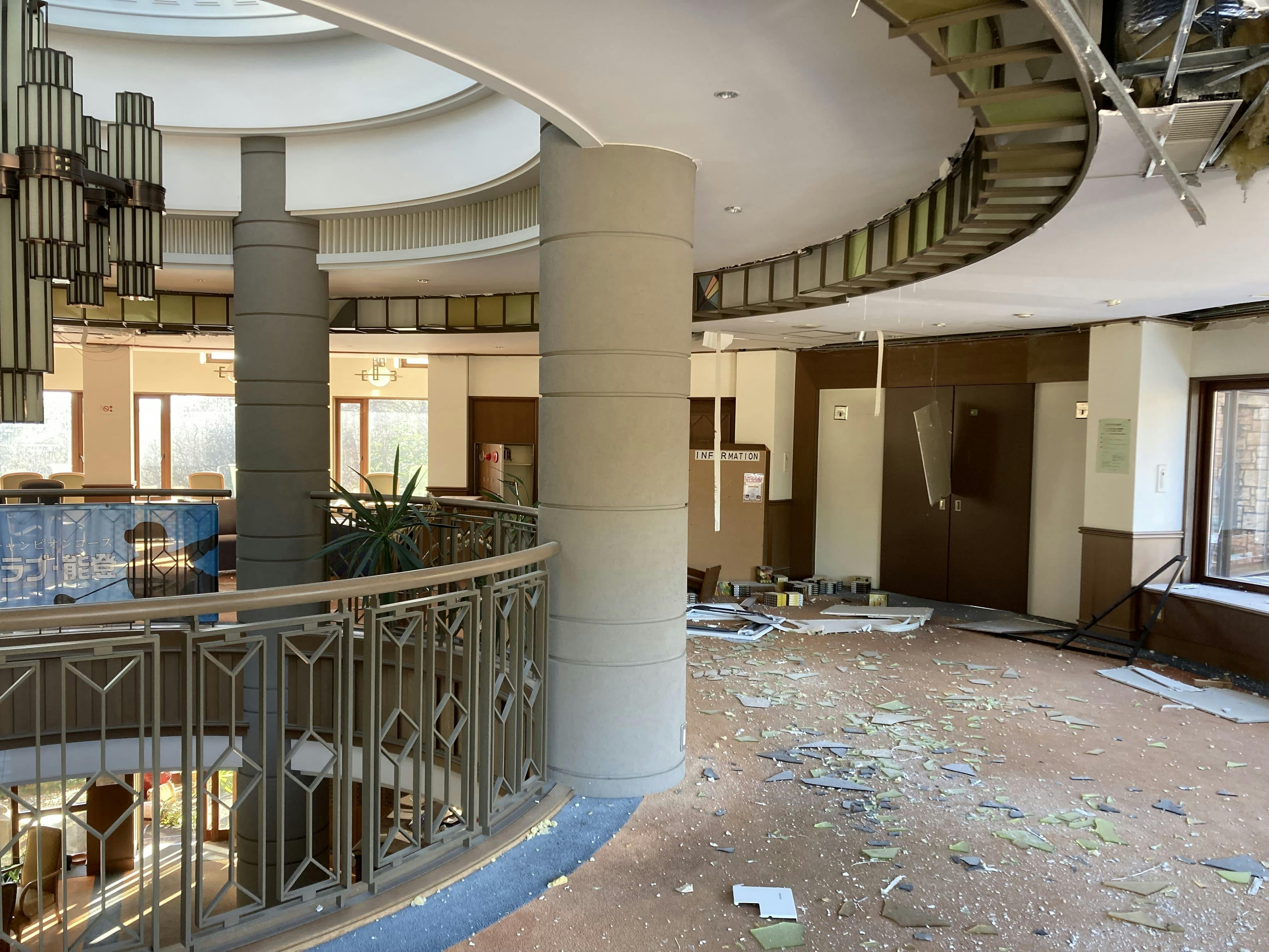 クラブハウスは大規模半壊。自動ドアが外れ、窓ガラスが割れ、外壁が崩れ落ち、ロッカーや浴室にも甚大な被害が出ていました。