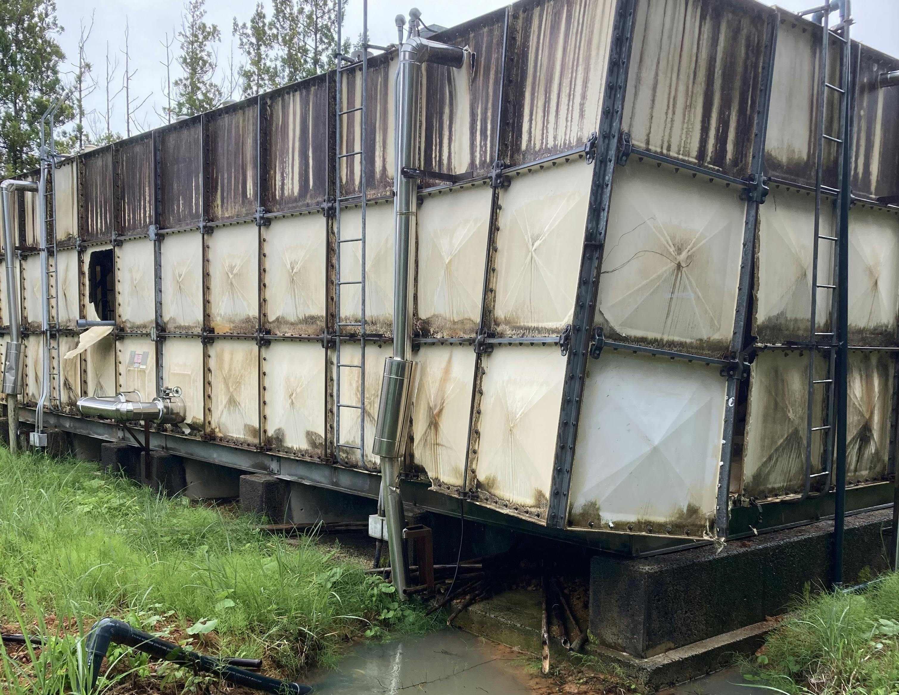 飲料水用と散水用の受水槽に亀裂が入り、断水状態。水が使えなければ芝生の維持管理ができません。その他、貯湯槽や受変電設備にも被害があり、営業再開の目途が全く立たない状況でした。