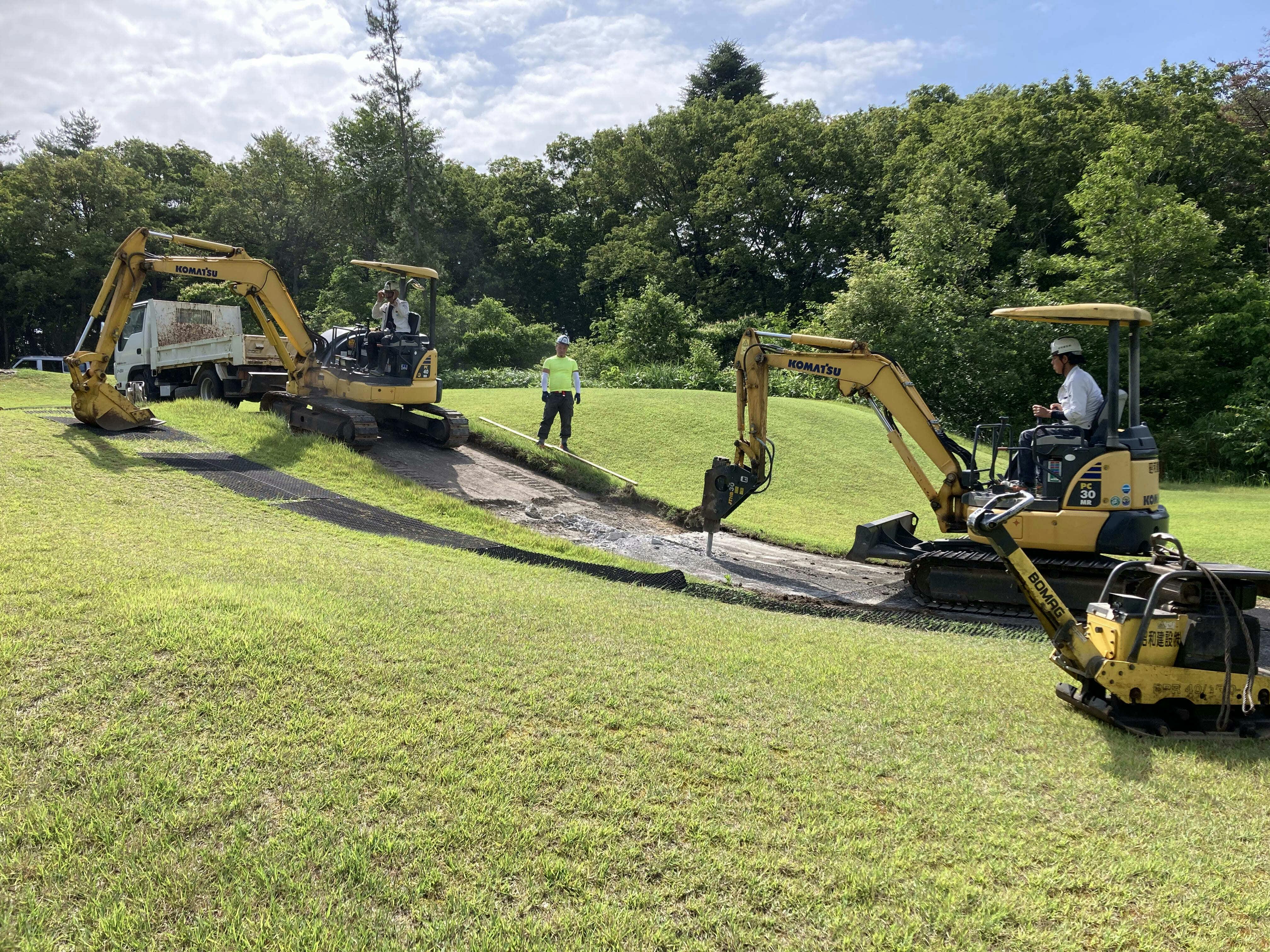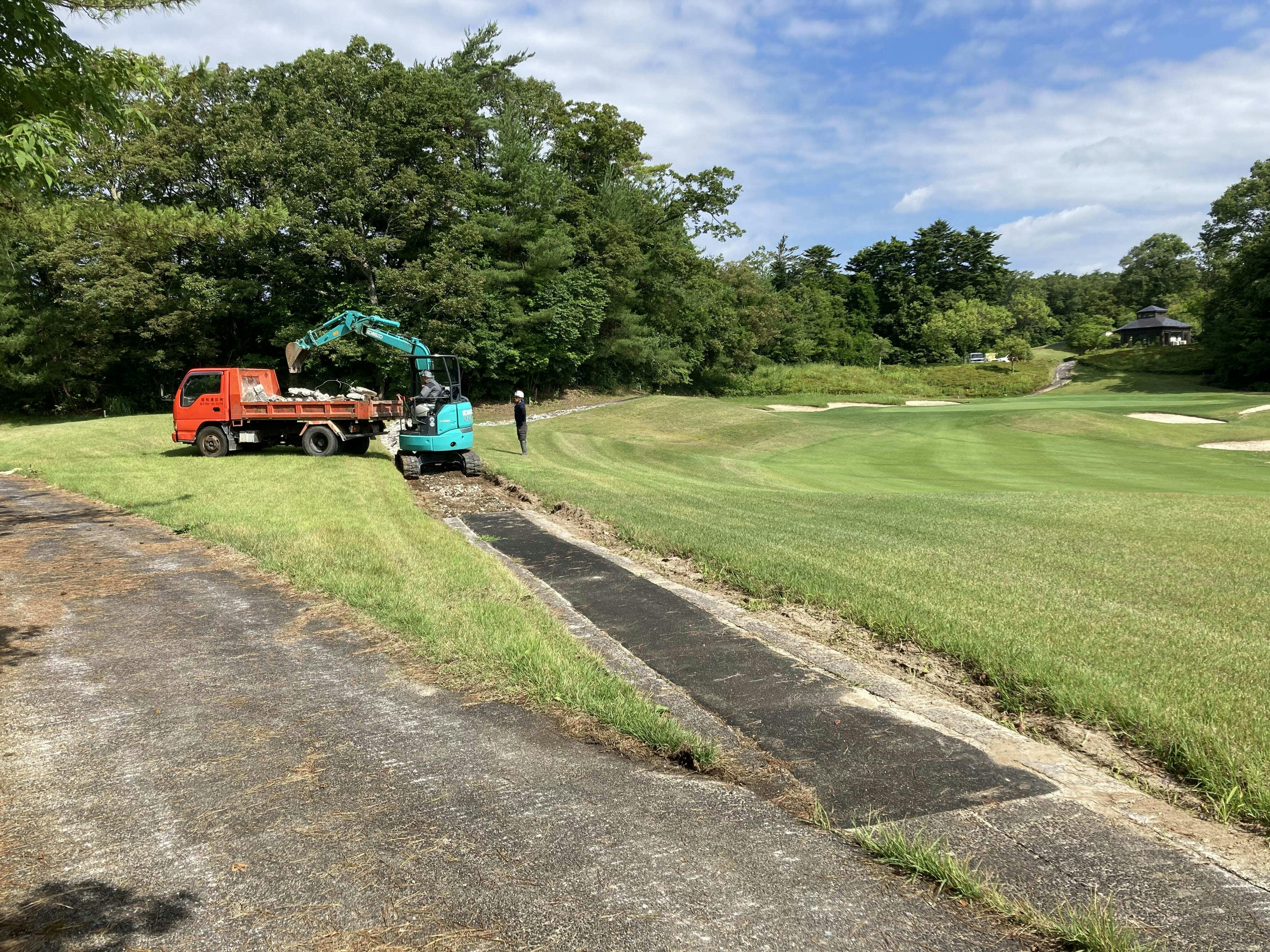 5月末まで通行止めとなっていた進入道路の高架橋工事も応急手当が完了し、6月に入ってようやく、コースの土木工事とクラブハウスの建築工事に着手して下さる業者が見つかり、設計事務所様の調査報告書をもとに見積額が見えてくるなど、本格復旧工事に進める目処がつきました。