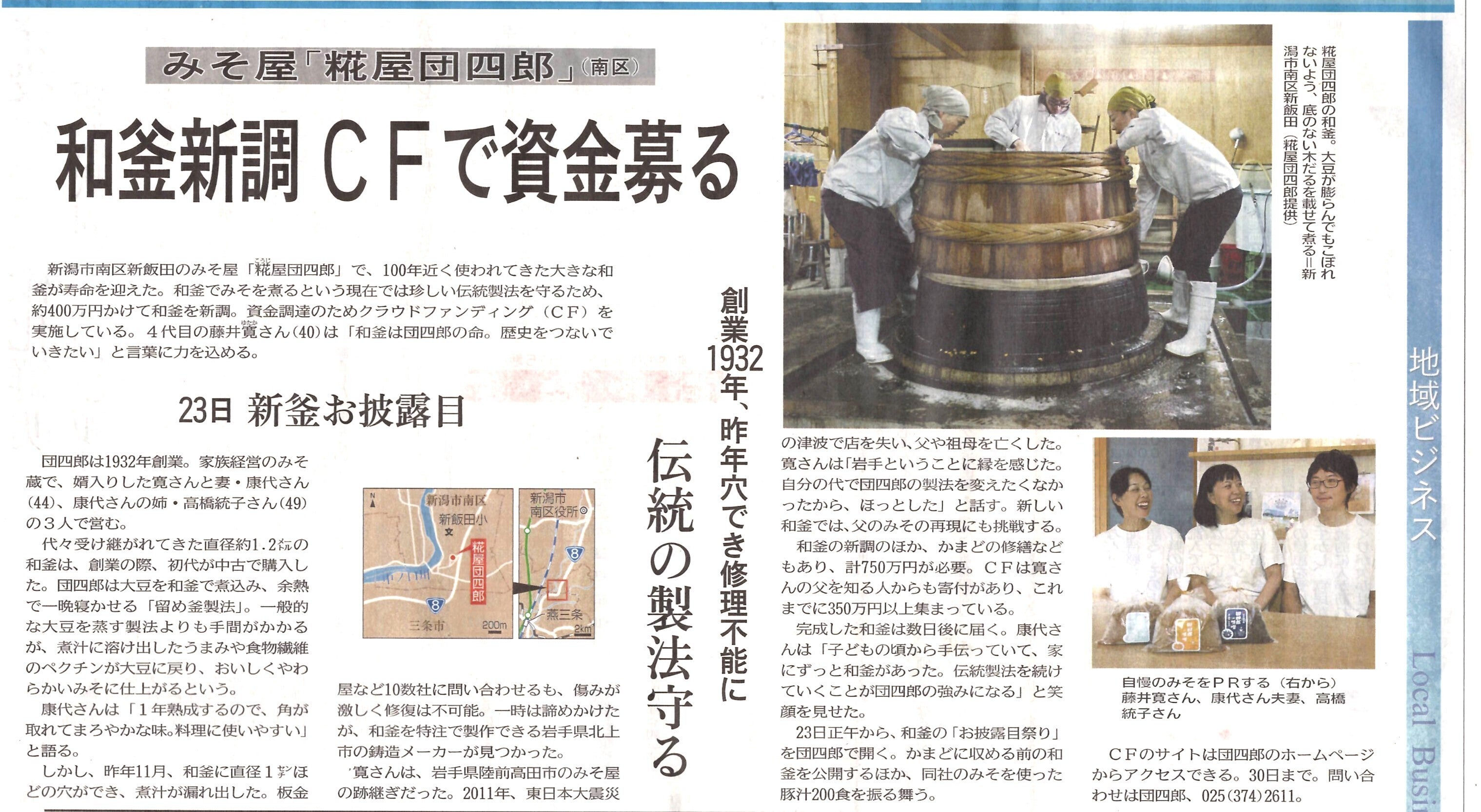 新潟日報に団四郎のクラファンチャレンジを大きく取り上げていただきました。