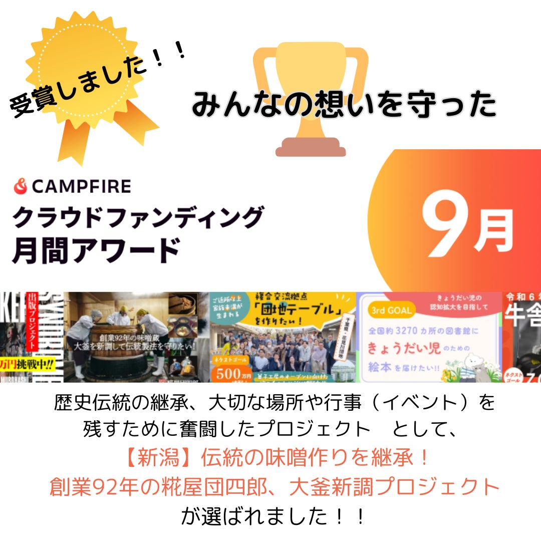新潟の伝統的な味噌作りを守り続ける創業92年の糀屋団四郎が、老朽化した大釜を新調するために立ち上げたプロジェクトです。地域の文化や食の伝統を継承するという強い思いが共感を呼び、多くの支援者から応援を集めました。大釜の新調は次世代に伝統を引き継ぐための重要なステップであり、このプロジェクトの成功が地域全体の活性化にもつながると期待されています。