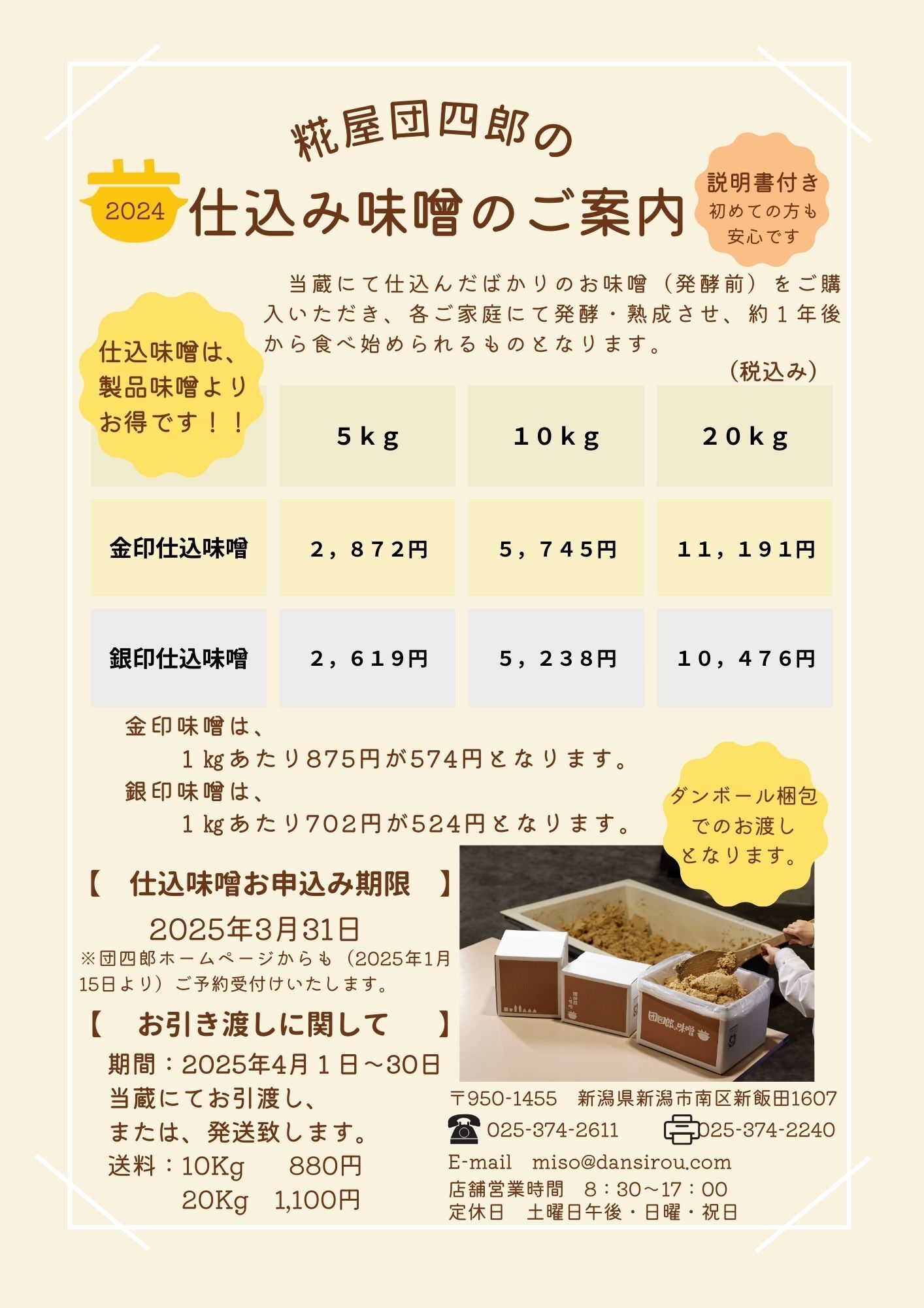 団四郎では、この『仕込み味噌』を3月31までお申し込みを承っております。