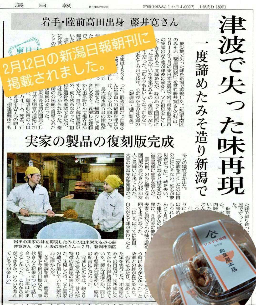 和泉屋復刻味噌ができるまのエピソードが綴られた記事が『新潟日報』と『岩手日報』に掲載されました。