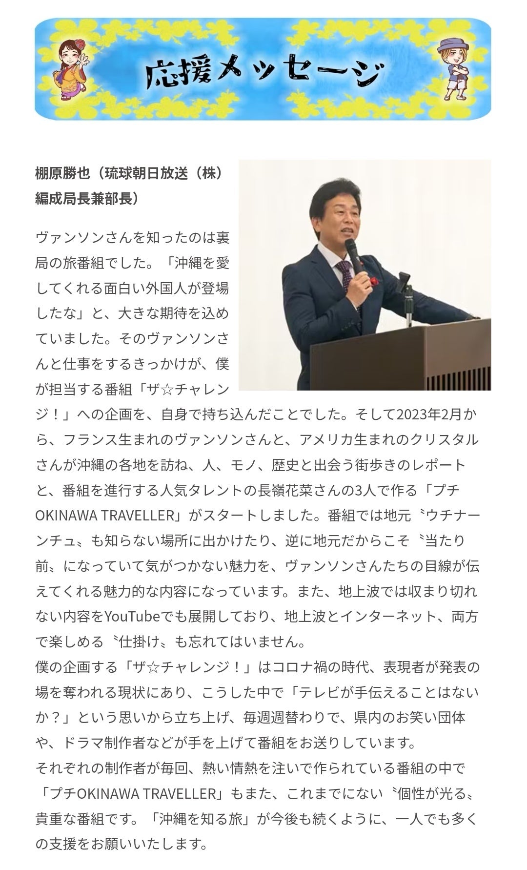 琉球朝日放送編成局長兼部長であり、プチ OKINAWA TRAVELLER テレビ版の担当でもある棚原勝也様よりクラウドファンディング応援メッセージを頂きました!