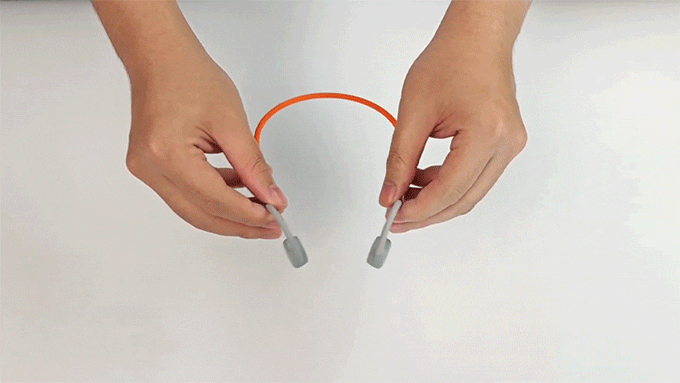 ②重さはわずか27g。外部はシリコン、内部は形状記憶チタン合金製で、快適な装着感と高い柔軟性を実現。