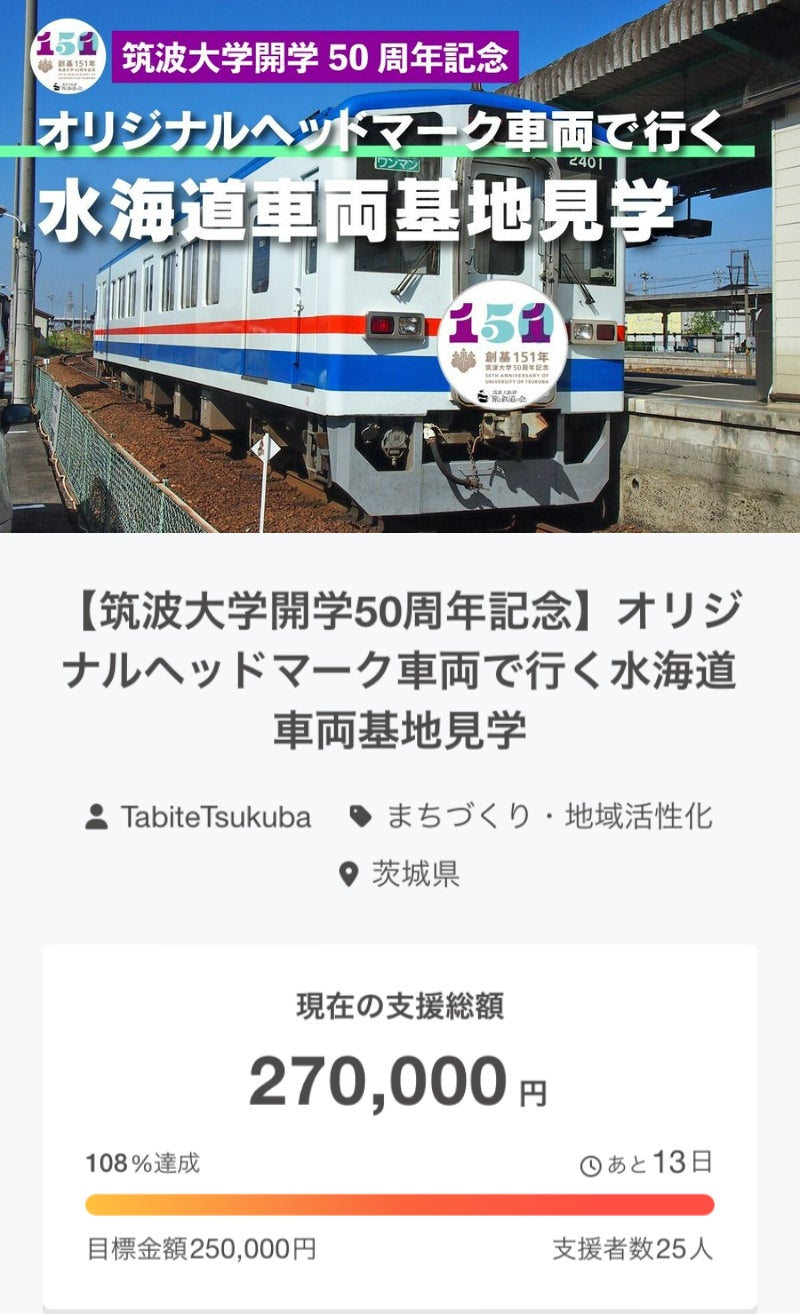 先日、クラウドファンディング「筑波大学開学50周年記念オリジナルヘッドマーク車両で行く水海道車両基地見学」の目標額が達成されました!