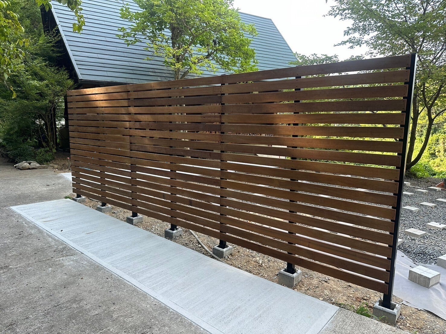 ウッドデッキの基礎部分プライベート空間を生み出すための、ウッドフェンスも同時並行で立てていき