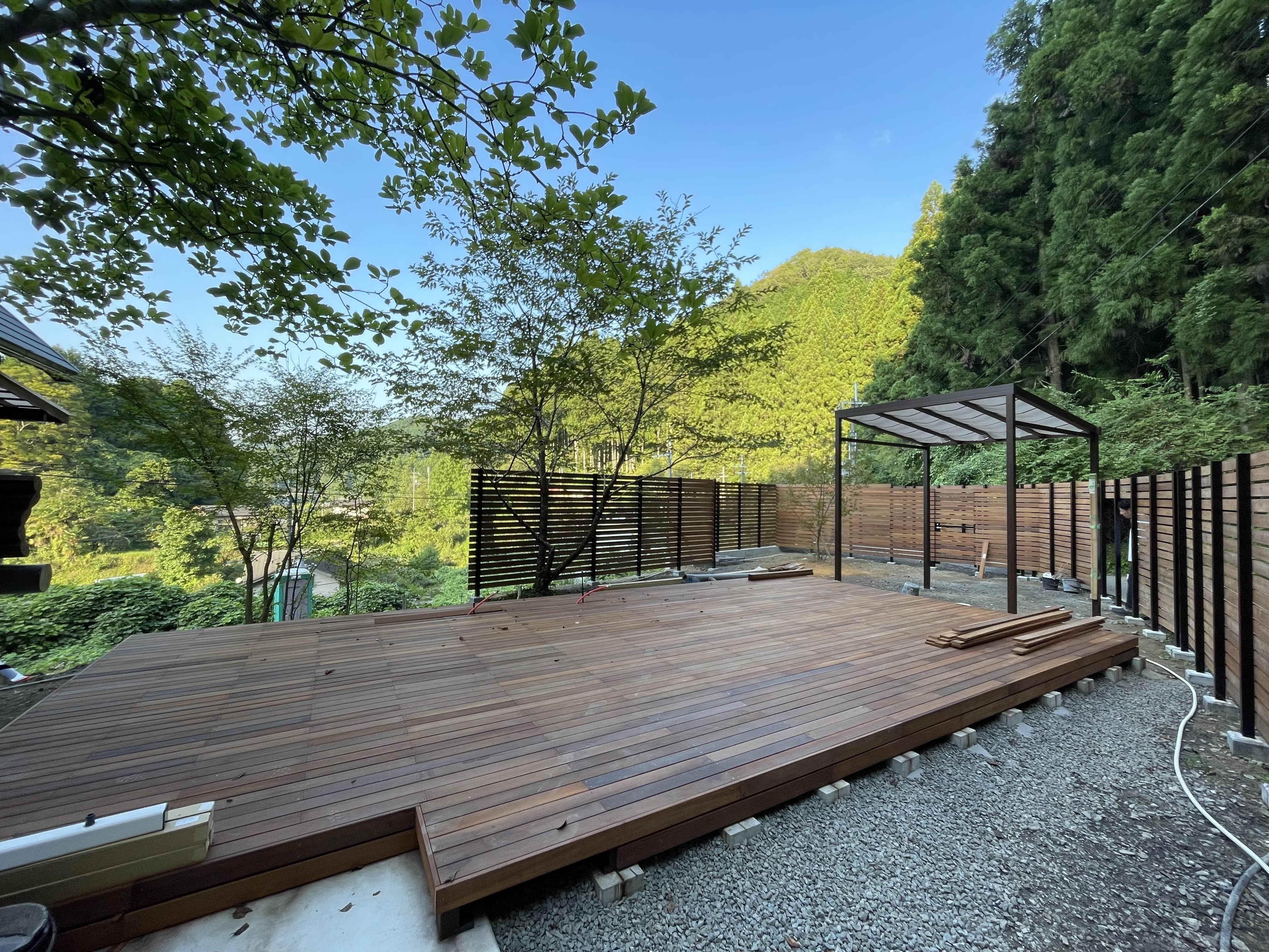 あれから工事も進み、メインエリアとなるウッドデッキ・バーベキューテラスがついに完成しました!!!