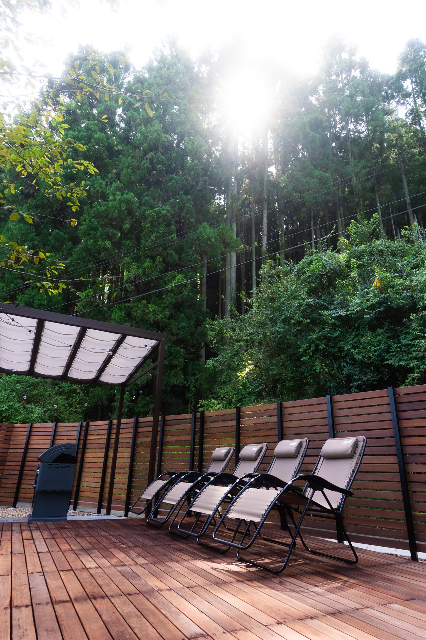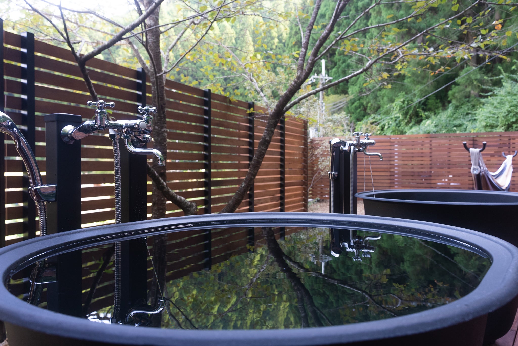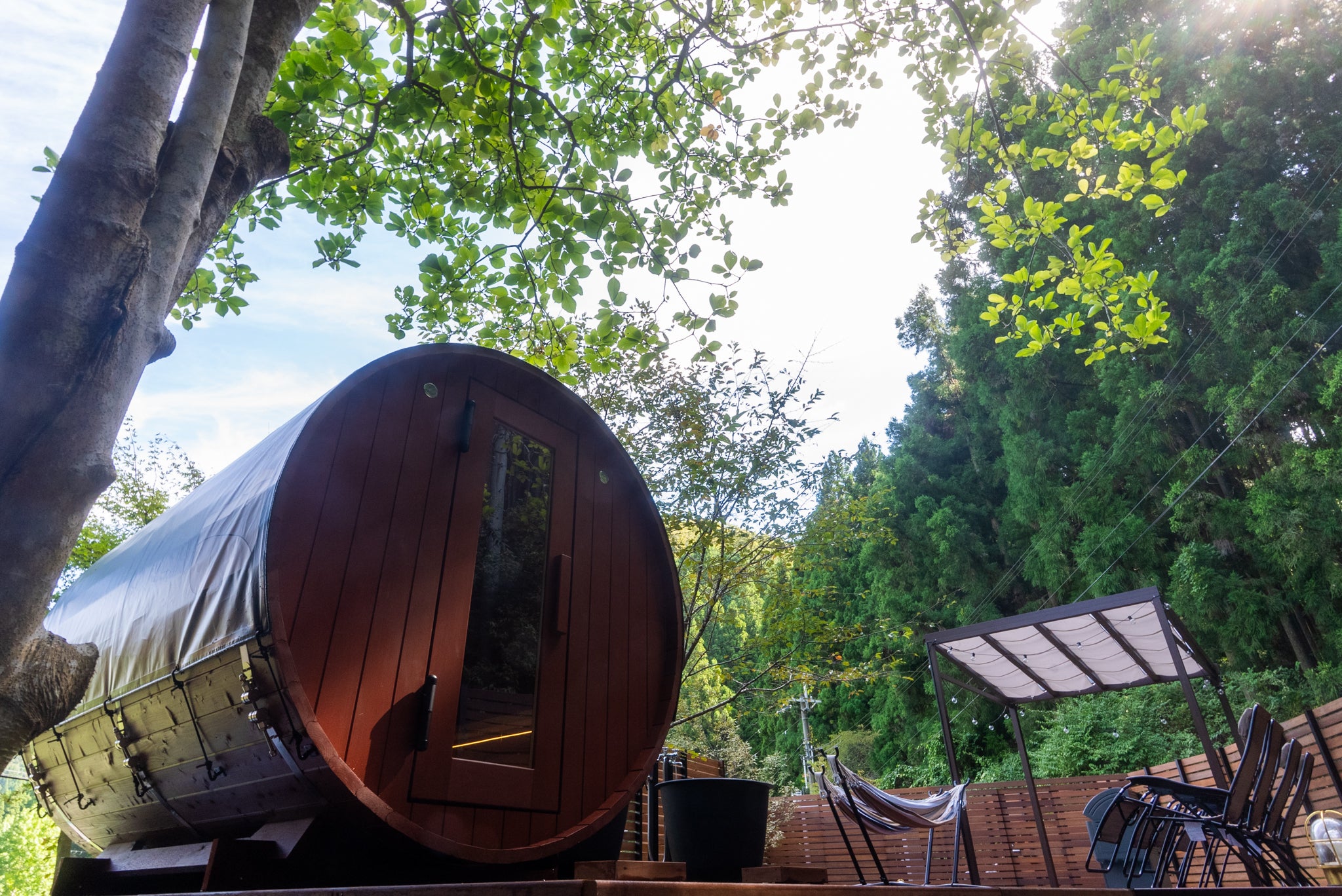サウナ→水風呂→外気浴はウッドデッキ内で裸足で回っていただけます。