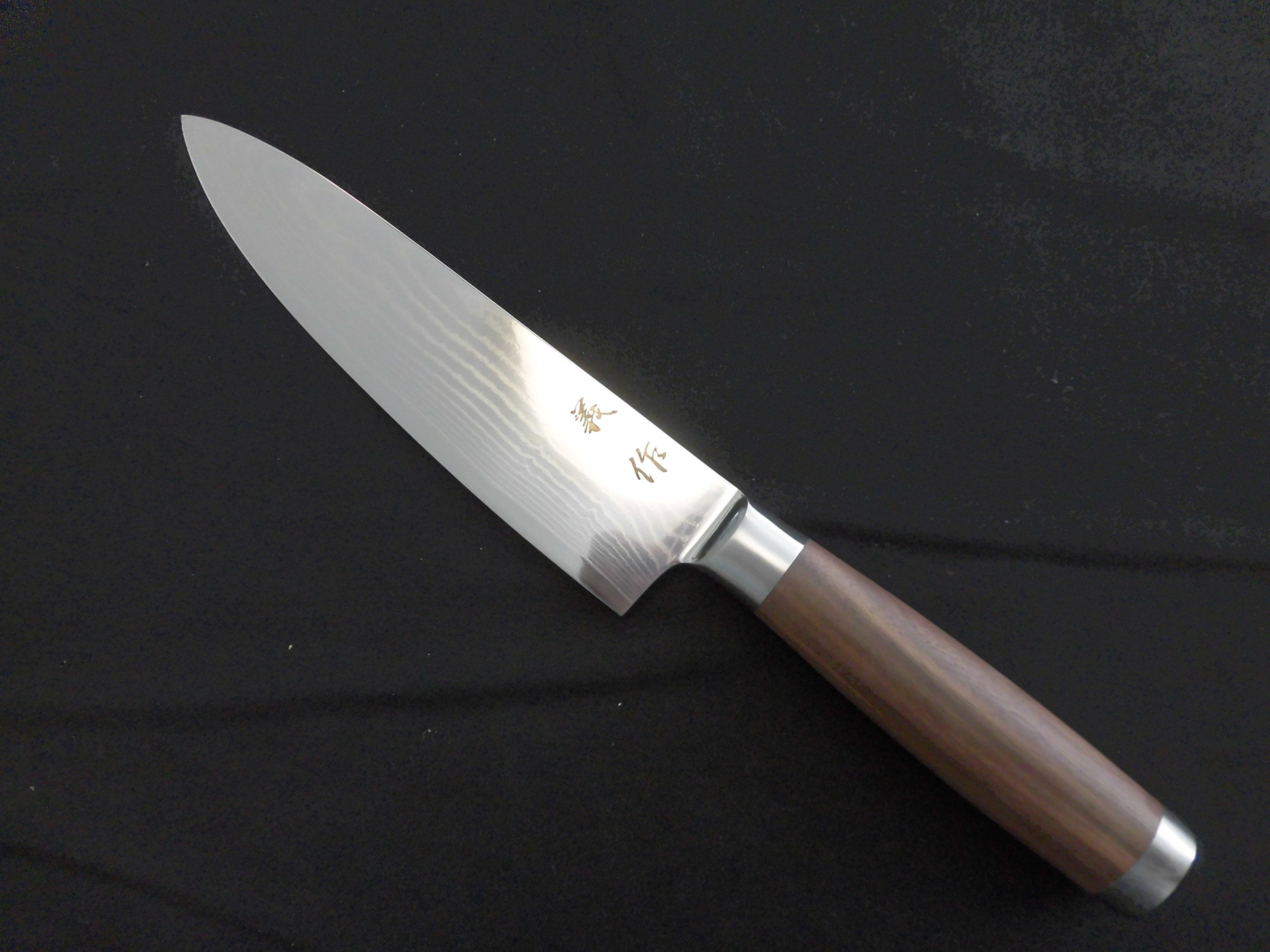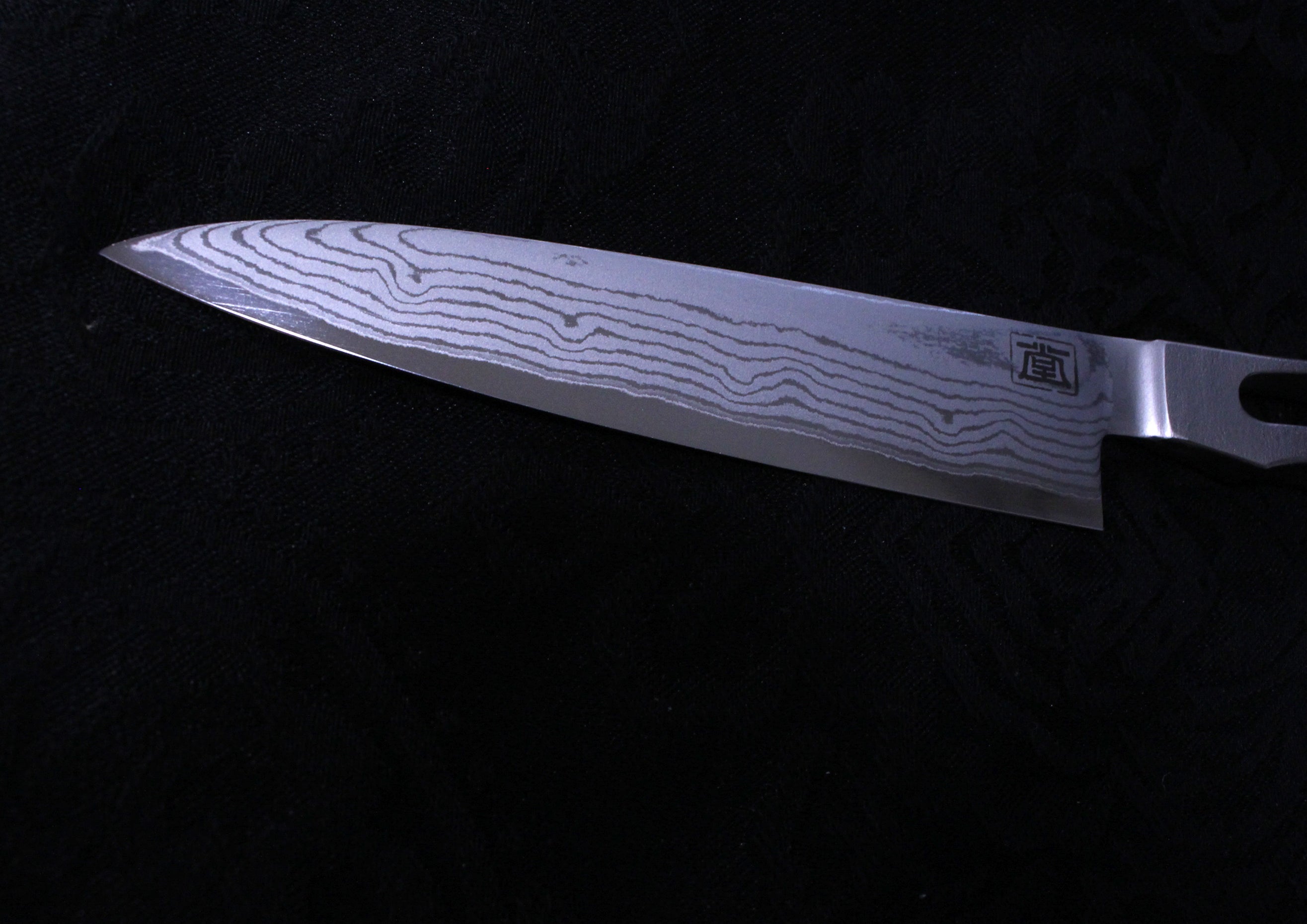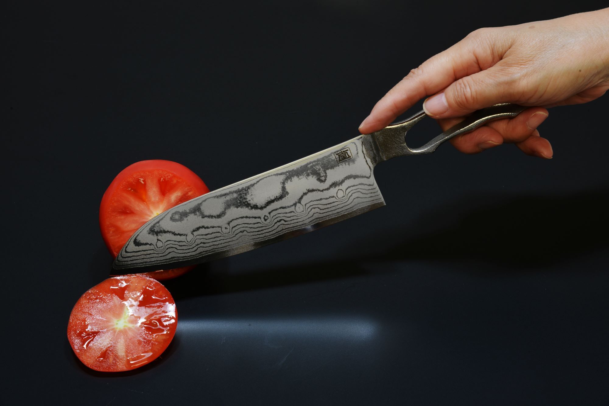 桐生氏が日本刀の工法に則り1本1本鍛錬した独自のダマスカスです。