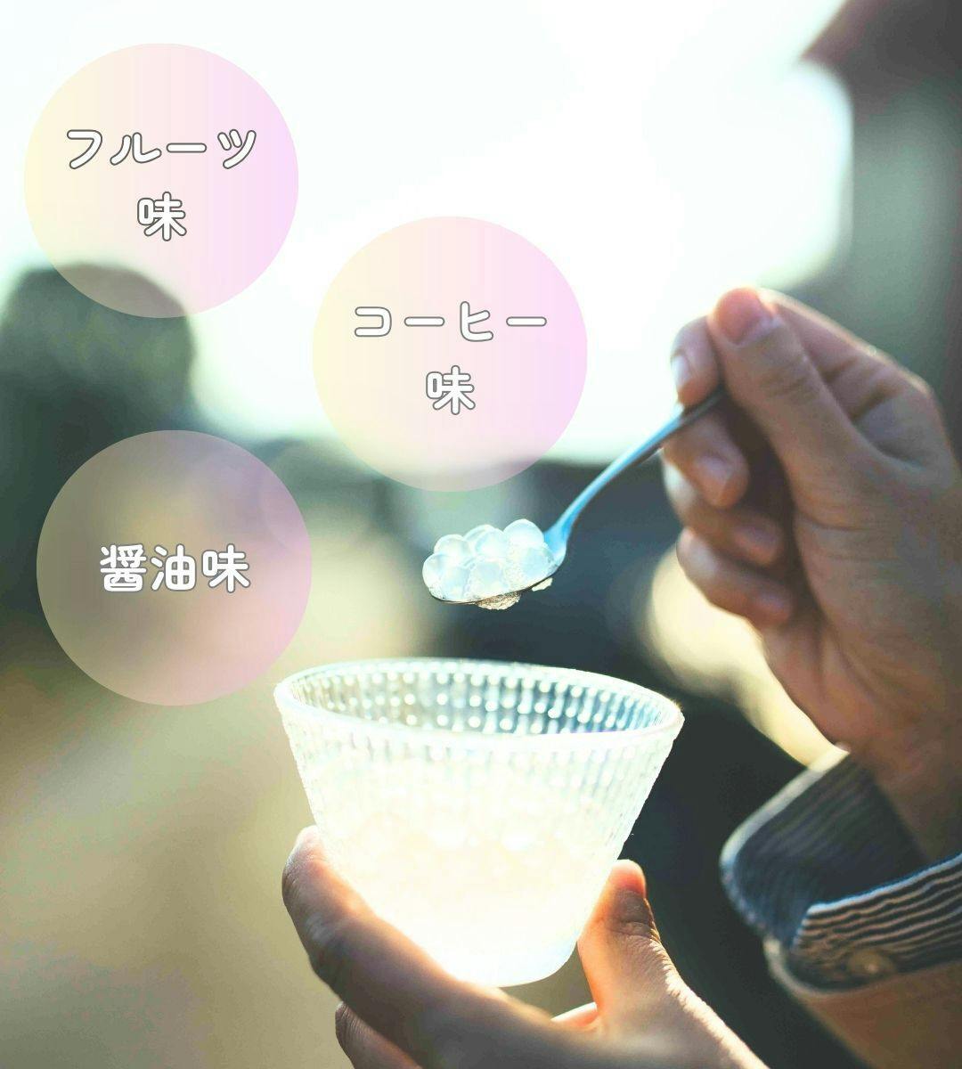 食品に乗っている粒々。この中にフルーツシロップや醤油などの液体を浸透させ、閉じ込めています。