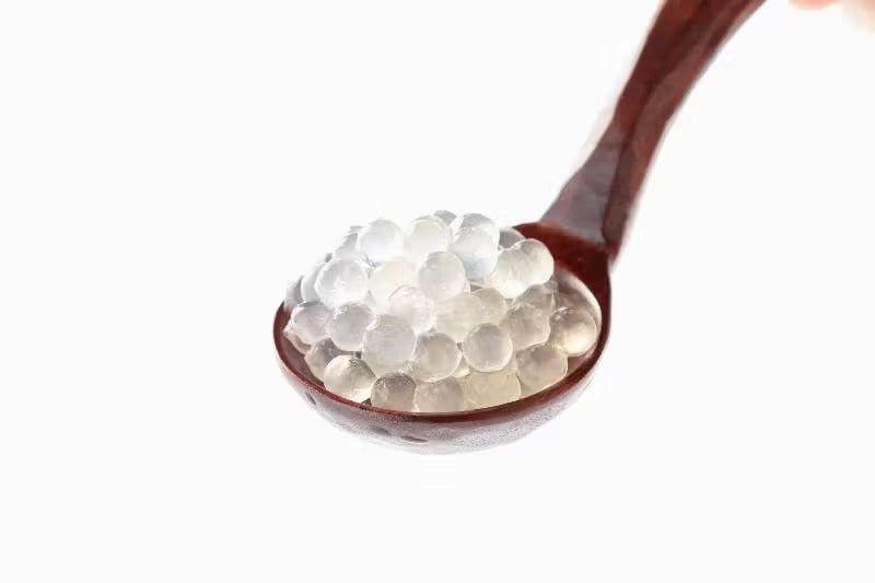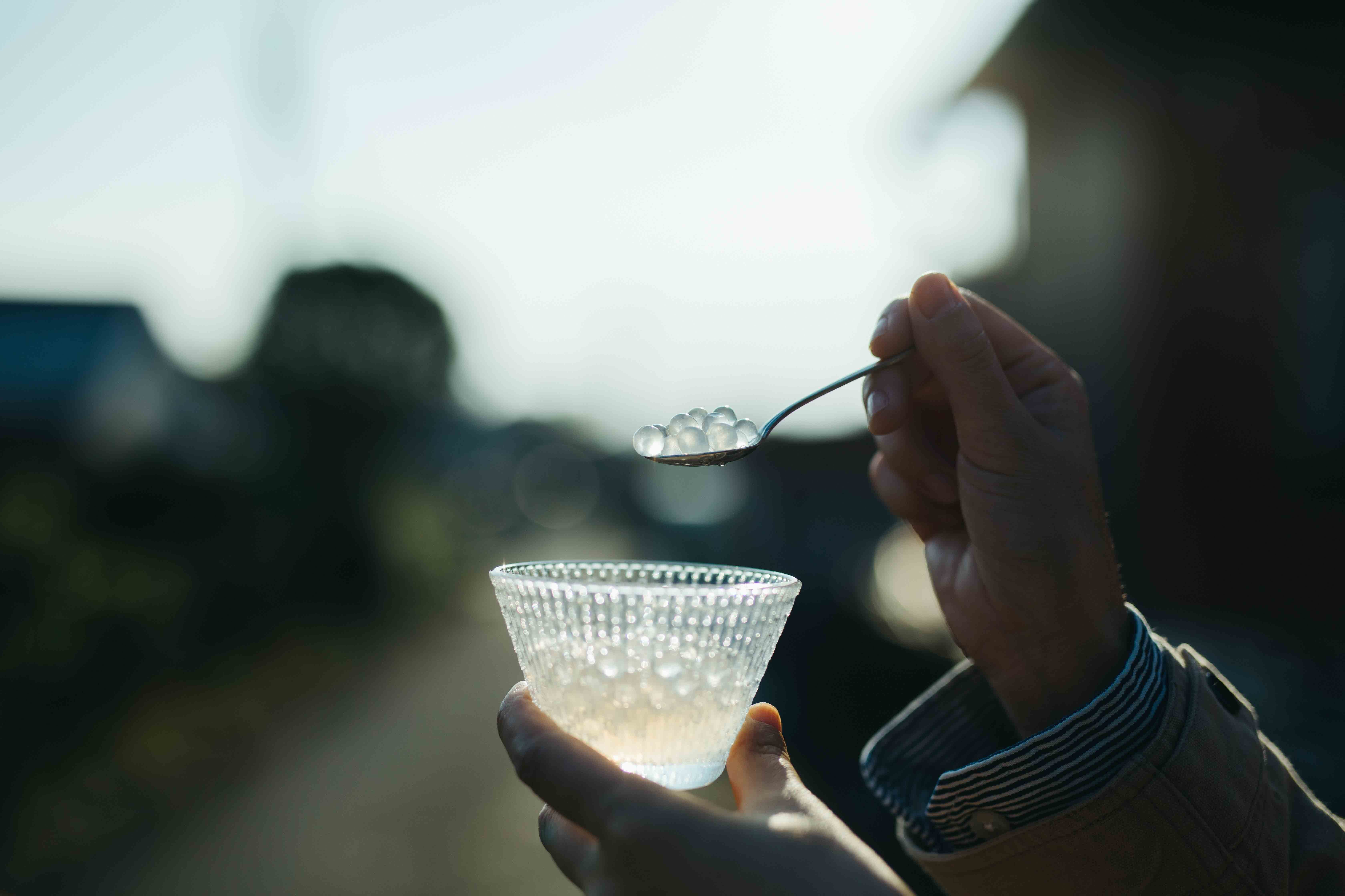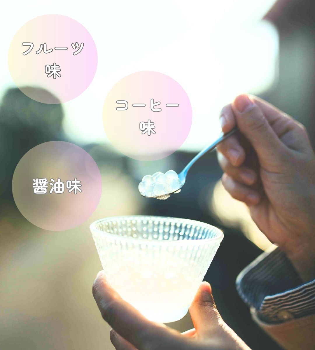 見た目は無色透明でプチっと弾ける食感、ほぼ無味無臭の粒状食品です。