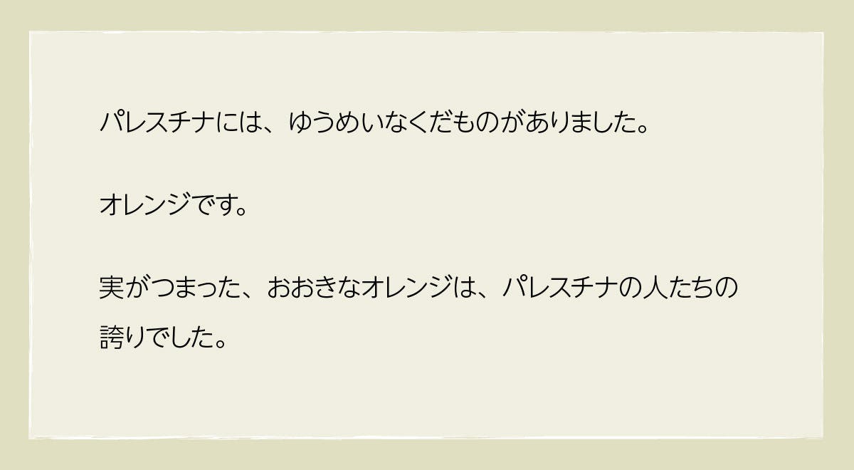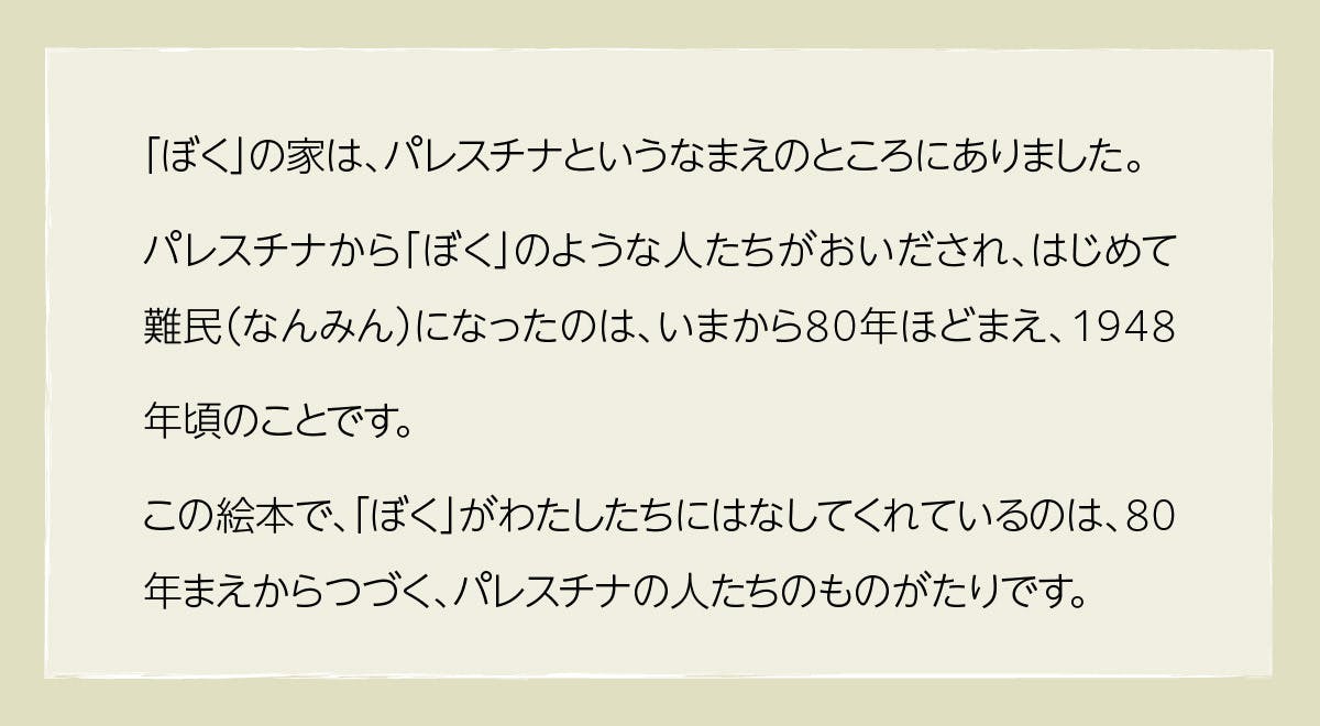 また、絵本の絵から、パレスチナの歴史と暮らしを見つけ出すヒントも示してくれています。