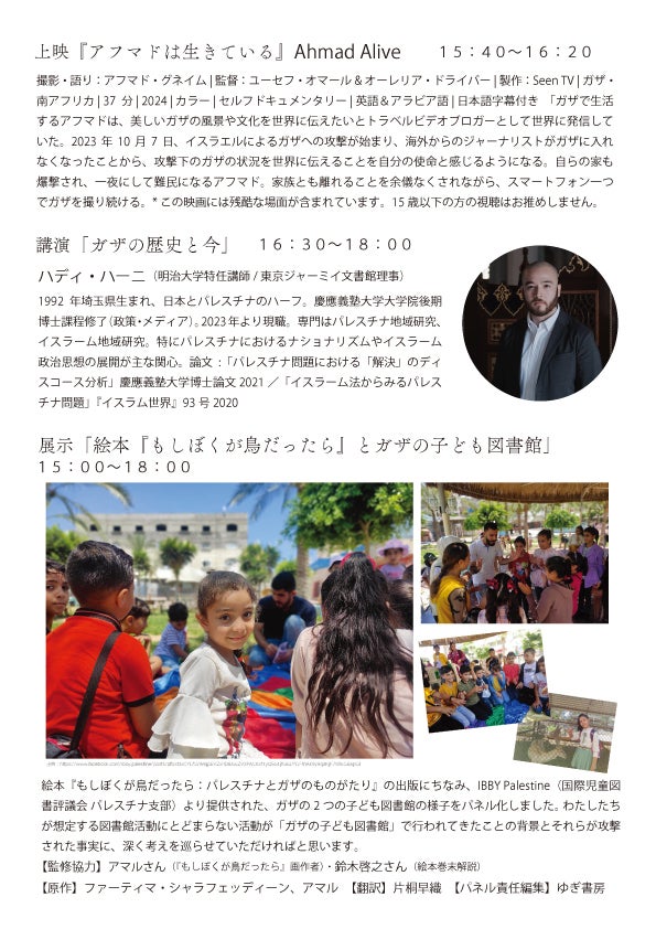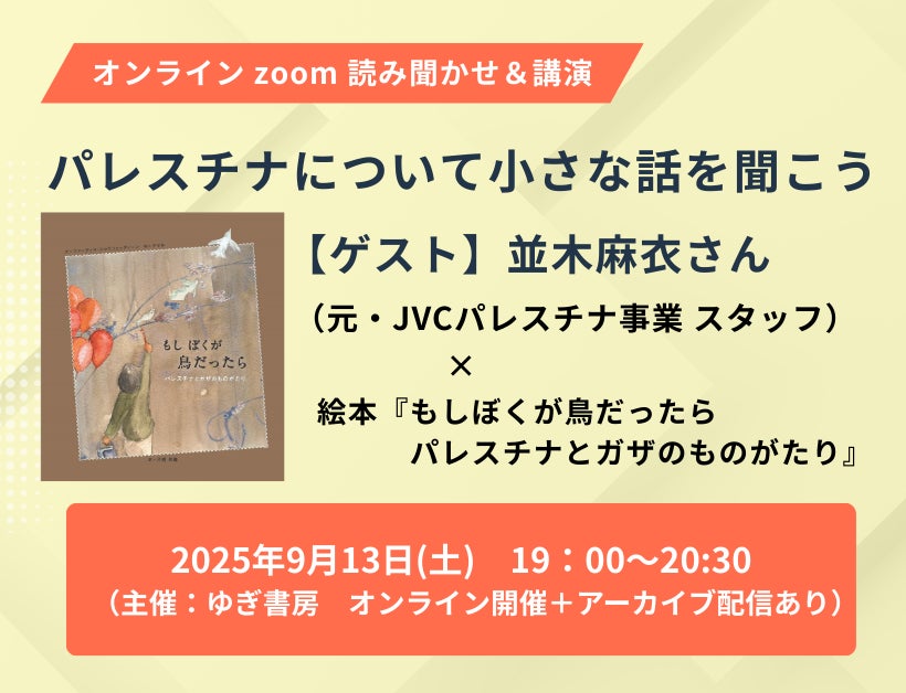 真鶴町のステキな書店さん・道草書店にて、「絵本『もしぼくが鳥だったら』とガザの子ども図書館」展が開催中です。講演会アーカイブの視聴会も開かれます。ぜひご参加ください。◆「絵本『もしぼくが鳥だったら』とガザの子ども図書館」展◆2026年3月2日(月)~31日(火) 11:00~17:00・日、水、祝日はお休み (変則あり。また、貸切営業の場合があります。)◆会場:道草書店 (神奈川県・真鶴町/JR真鶴駅より徒歩5分ほど)詳細は以下より道草書店 インスタグラムnightjar/よだか インスタグラム※インスタグラム閲覧できないなどの場合には、ゆぎ書房info@yugishobou.com へお問い合わせください。◆講演会アーカイブの会場視聴会(1/23ゆぎ書房開催の鈴木啓之さんご講演アーカイブ視聴会)「パレスチナについての小さな話をみんなで聞こう」◆日時 2026年3月22日(日)①開場9:45、上映10:00~11:30ごろ②開場13:45、上映14:00~15:30ごろ各回の終映後1時間ほどおしゃべりタイムあり(自由参加)◆会場 道草書店 (神奈川県・真鶴町/JR真鶴駅より徒歩5分ほど)詳細とお申込みは以下より道草書店 インスタグラムnightjar/よだか インスタグラム※インスタグラム閲覧できないなどの場合には、ゆぎ書房info@yugishobou.com へお問い合わせください。