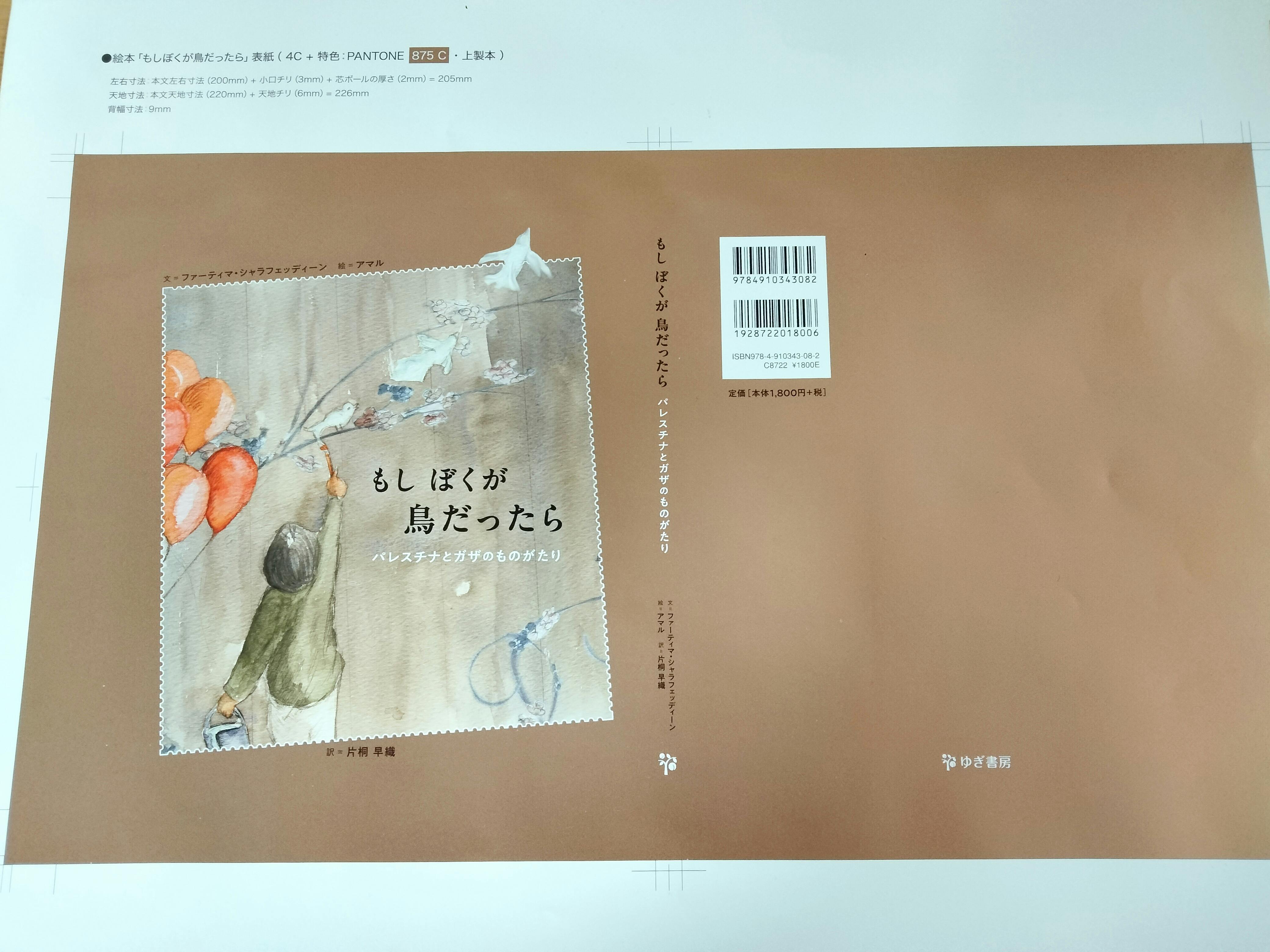 絵本『もしぼくが鳥だったら――パレスチナとガザのものがたり』日本語版の色校が届き、あまりに美しかったので、記念写真を撮りました(今までに撮ったこと、ありませんでしたが)。