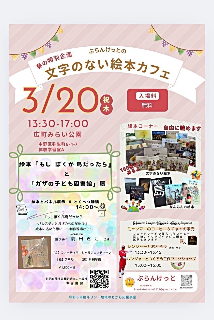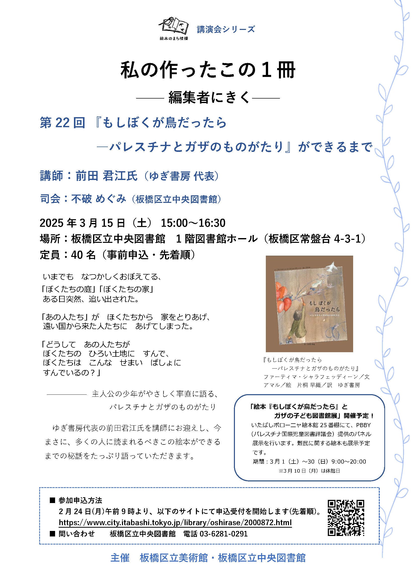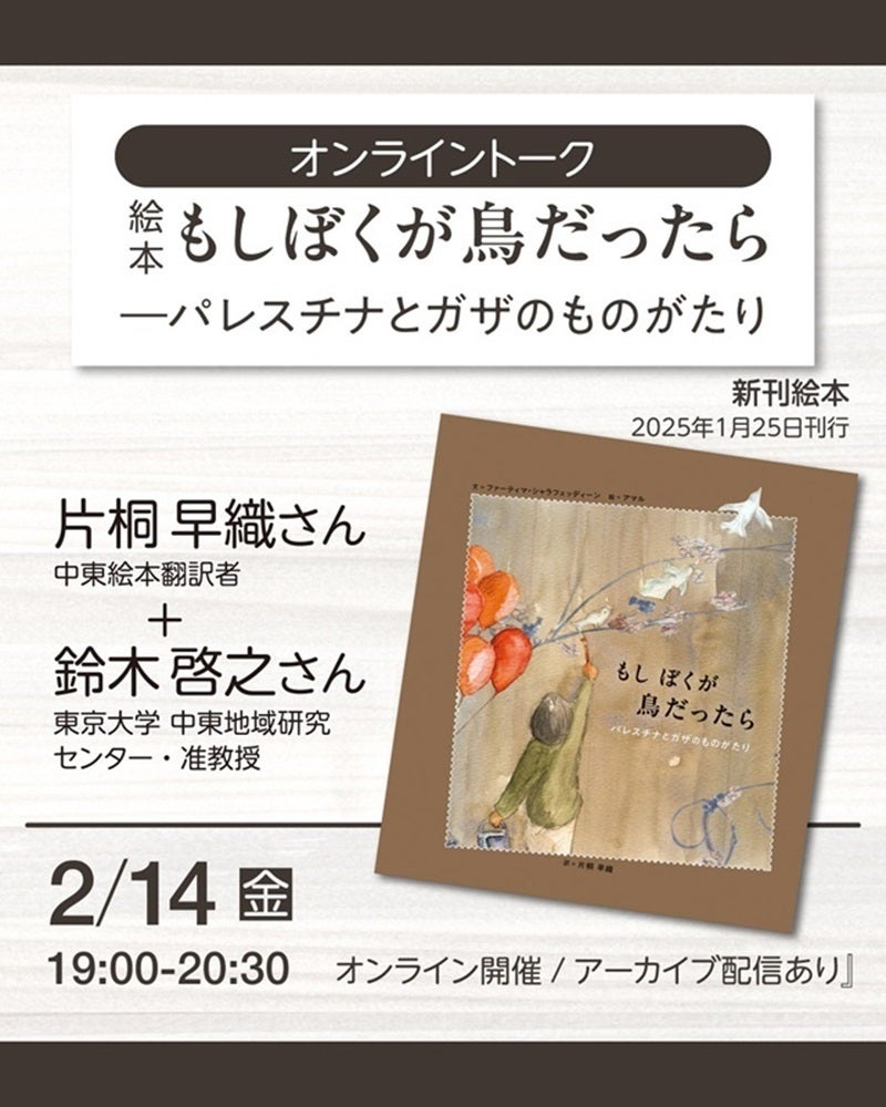 「絵本『もしぼくが鳥だったら』とガザの子ども図書館」展と絵本トークが東京外国語大学附属図書館(東京都府中市)にて開催されます。所属学生さん以外の一般の方も観覧・参加可能です。是非足をお運び下さい。(日時)4月14日(月)〜4月25日(金) 平日9:00-20:00 /土曜日 13:00-20:00 ※20日(日)は休館 https://www.tufs.ac.jp/library/(場所)東京外国語大学附属図書館2Fブラウジングコーナー※観覧無料・入館手続き不要https://www.tufs.ac.jp/library/blog/is/g/news/2025/04/10770/ 【絵本トーク】4月25日(金)16:00~17:00「『もしぼくが鳥だったら』とガザの子ども図書館展」―専攻地域のこと、子どもたち・大人たちにどう伝えますか? ―」トーク ゆぎ書房代表・前田君江(場所)附属図書館2Fブラウジングコーナー(無料/要・参加申込)https://forms.gle/mQXu46FSY13uHRjs9 https://www.tufs.ac.jp/library/blog/is/g/news/2025/04/10770/