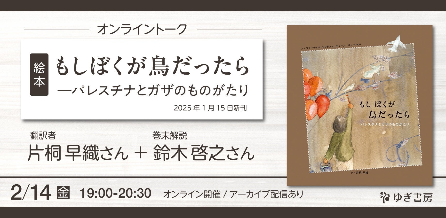 パネル展のお知らせです。現在、東京都中野区にて、開催中です。【開催情報】「絵本『もしぼくが鳥だったら』とガザの子ども図書館」展「絵本ラウンジLOOP なかの」内 「なかのギャラリー」2025/2/1(土)〜28(金) 10:00~17:00(日曜・月曜は休館)東京都中野区 中野セントラルパークイースト1階※ギャラリーコーナーは入場無料https://ehonlg.loop-for.org/【Instagram】https://www.instagram.com/p/DFhUXvmpofE/?utm_source=ig_web_copy_link&igsh=MzRlODBiNWFlZA==【展示内容の紹介】2007年にIBBY Palestine によって作られたガザ地区の二つの図書館。図書活動とともに、度重なる侵攻による子どもたちのトラウマを少しでもやわらげるためのサマーキャンプや、演劇の仕組みを応用した心理療法も大きな活動でした。イスラエルの攻撃で損壊と再建を繰り返しながら継続してきた活動の一端をパネルにしました。この2つの「ガザの子ども図書館」も、他の多くの図書館や文化施設と同様に、2023年10月以降の攻撃で破壊されてしまい、すでにありません。 ただ、「そもそも、ガザに図書館があったなんて知らなかった」と仰る方も多いです(ときに「字が読めるんですね」(?!)とも)。まずは、ガザに図書館があったこと、子どもたちがどんなにか楽しそうに本を読んでいたこと、そして、子どもたちのために真摯に活動してきた司書さんやスタッフさんたちのことを、難しい説明は抜きで、写真で見て感じていただけたらと思います。【開催概要】(出典・許諾)IBBY Palestine 公式HP、Official Facebook Page of IBBY Palestine(@IBBY Pal)(協力)アマルさん(『もしぼくが鳥だったら』画作者)鈴木啓之さん(同絵本巻末解説、東京大学中東地域研究センター・特任准教授)(責任編集)ゆぎ書房 世界を旅する翻訳絵本の出版社info@yugishobou.com*本展示は、CAMPFIREクラウドファンディング「パレスチナ/ガザの翻訳絵本を緊急出版したい+「ガザの子ども図書館」展を全国で」(2024年9~10月)の「社会的リターン」として企画されました。*展示のご協力をいただける書店様・団体様は、 info@yugishobou.com までお知らせ下さい。【ゆぎ書房note】「絵本『もしぼくが鳥だったら』とガザの子ども図書館」展について 【開催終了報告】