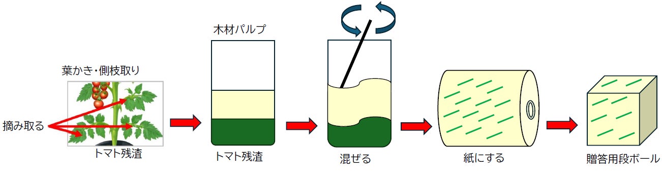 トマトの残渣を入れた紙が出来ればパッケージや梱包用段ボール(贈答用も含む)、パンフレットや名刺等様々な製品が出来、葉や茎も再利用することが出来ます。
