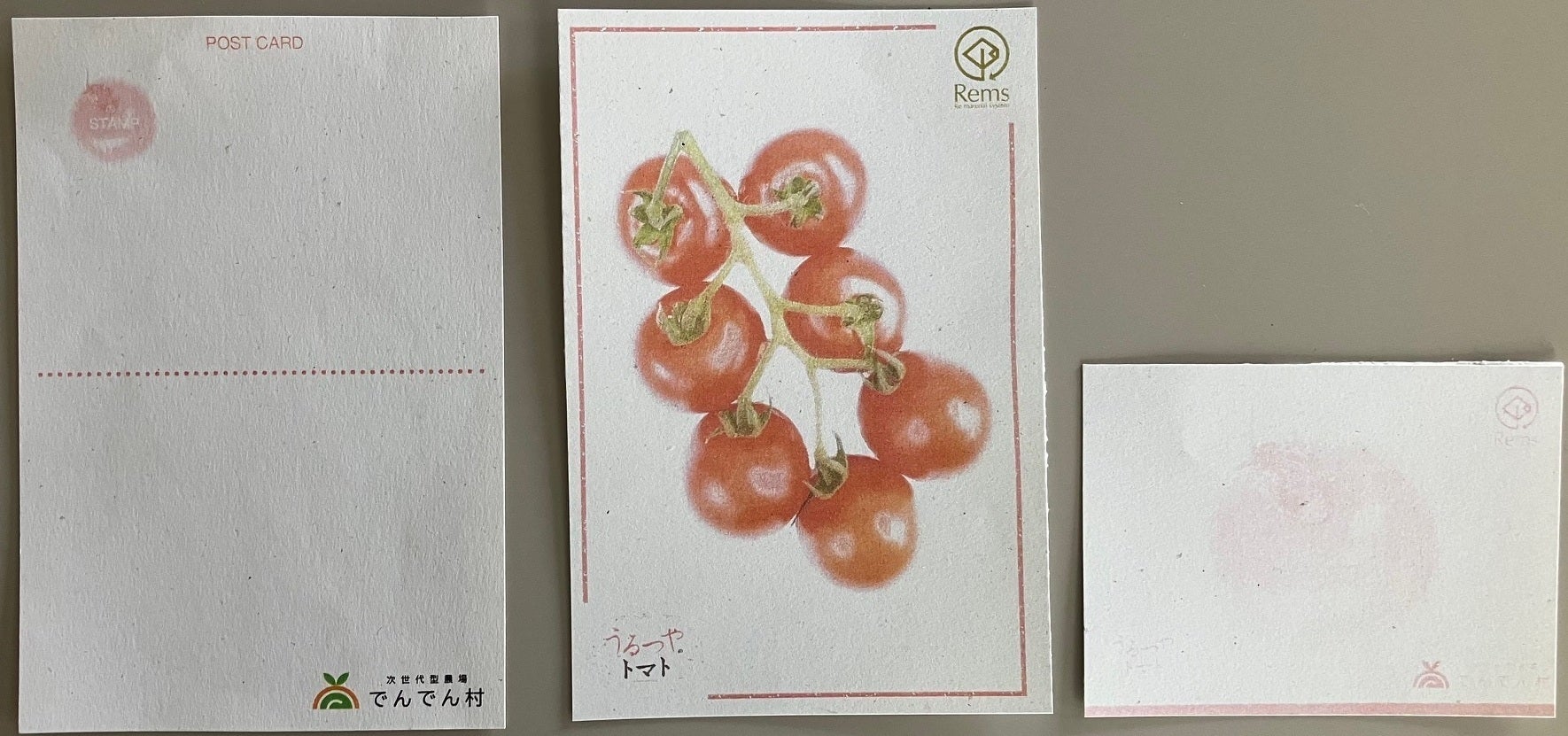 次世代型農場でんでん村では、2024年12月にミニトマトの残渣をダイオーペーパープロダクツ株式会社(残渣を紙の原料に利用するシステムを手掛ける大王製紙株式会社様のグループ会社) 富士事業所様の製紙工場に送り、残渣5%(対パルプ比)の混抄紙を試作しました。