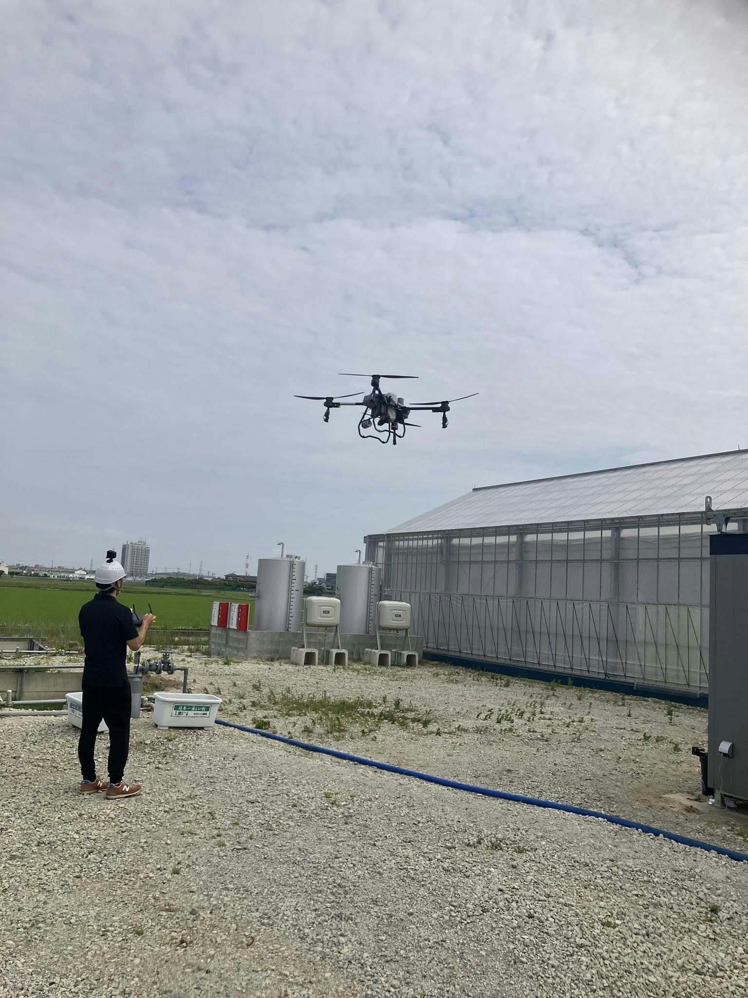 今年も高温・高日射対策でドローンによる遮熱材散布を行いました。人の手で散布するより、ドローンのアトマイザーで均一に屋根に散布することができます。良い品質のリターン品が提供できるように夏越し栽培を行います。