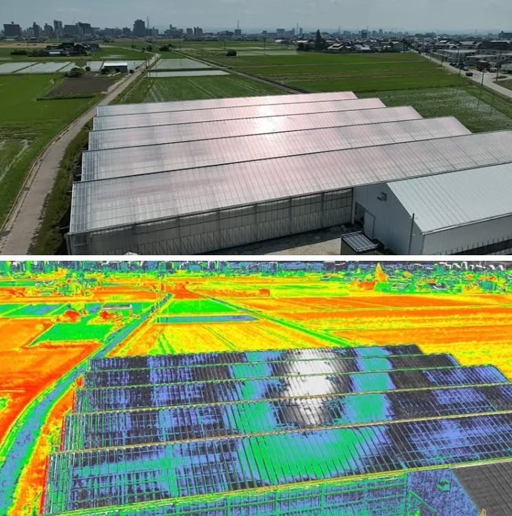 農業用ハウスの屋根にドローンで遮熱材散布を散布した効果が赤外線サーモグラフィ画像で冷却効果を確認できます。写真でも、赤外線を反射してピンク色に屋根が見えます。品質の良いリターン品を提供できるように夏越し栽培を行います。