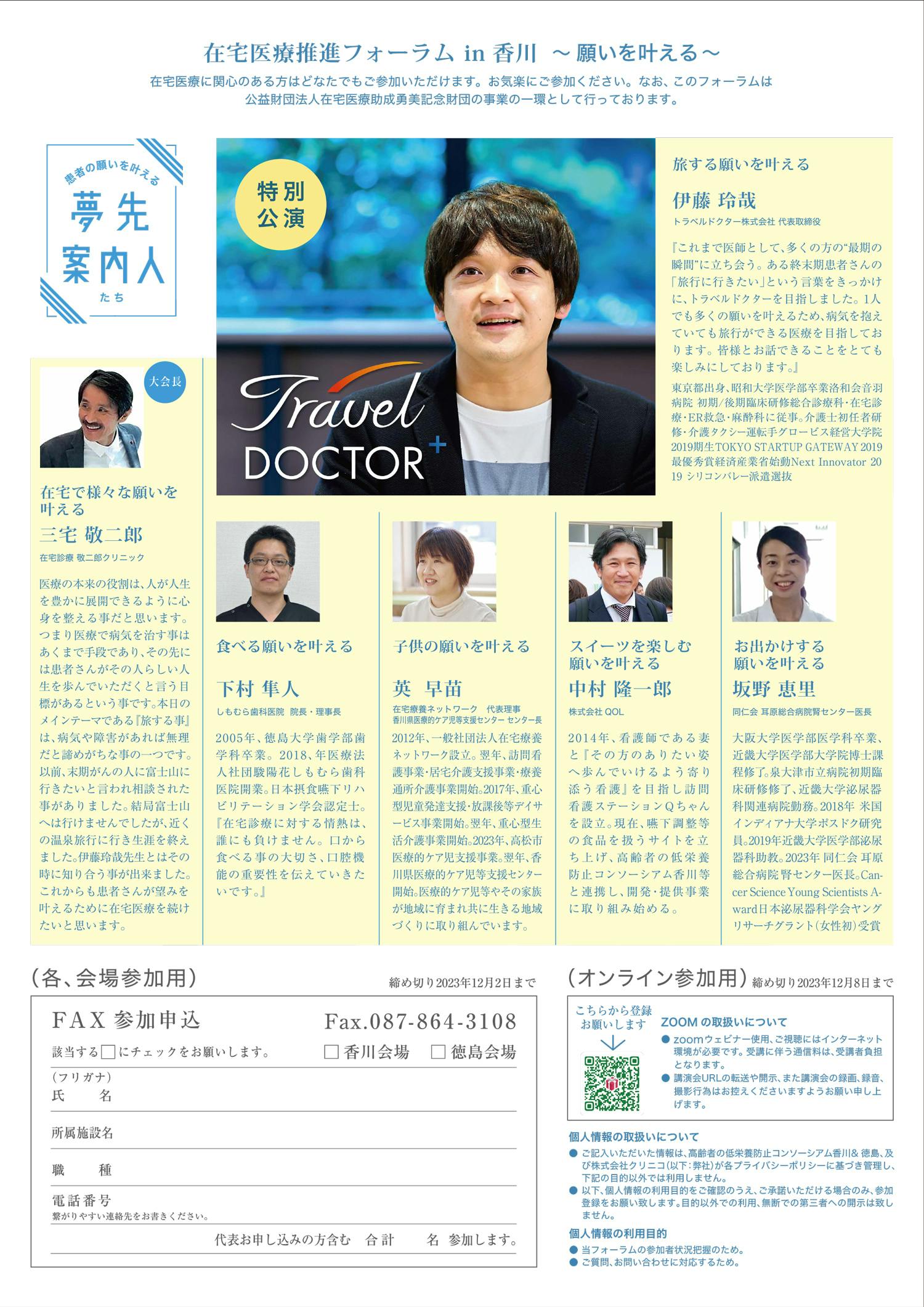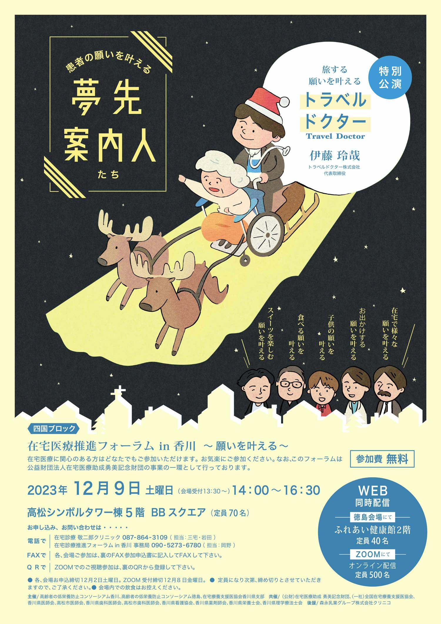 私たちも所属する、「高齢者の低栄養防止コンソーシアム香川(「いつまでも美味しく食べる」健康増進を支援)」代表世話人であり「一般社団法人LinkEatさぬき(食(食べる)でつながる、地域の人・社会に貢献する)」代表理事である「医療法人社団 慈風会 在宅診療 敬二郎クリニック」名誉院長 三宅 敬二郎先生主催の「在宅医療推進フォーラムin香川 ~願いを叶える~」では、当社専務取締役の中村も志を共にした「患者さんの願いを叶える 夢先案内人」の皆さんと一緒に登壇させていただきました。また同フォーラムでは、トラベルドクター「旅する願いを叶える」伊藤 玲哉先生をお迎えし特別公演をお願いし、このプロジェクトについて意見交換をさせていただきました。