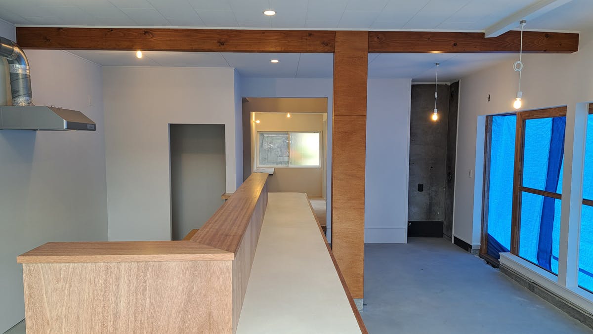 現在、カウンター内にはシンクが取り付けられています。この後、ガス台や冷蔵庫、作業台などが設置されていきます。