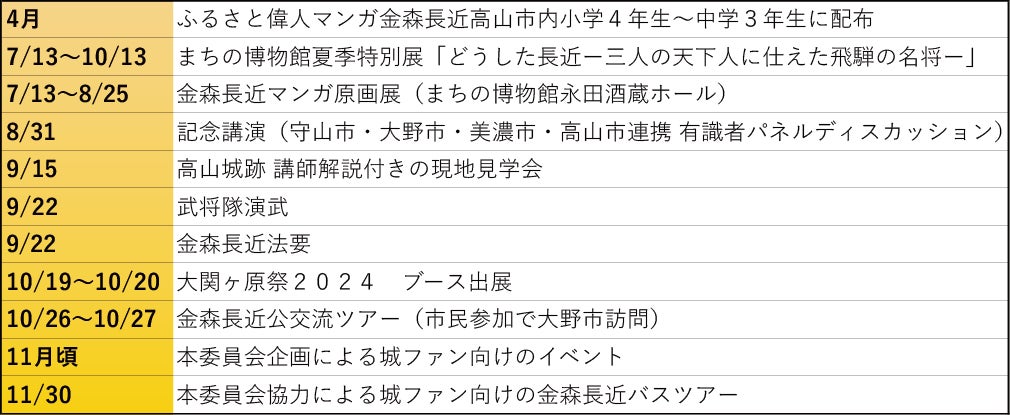 イベントスケジュール現在自治体において企画されているイベントは以上ですが、さらに盛り上げ市外・県外の歴史ファン・城ファンの方々に飛騨高山に来てもらいたいので本推進委員会で11月に城ファン向けのイベント、および生誕500年記念商品の制作を企画しています。