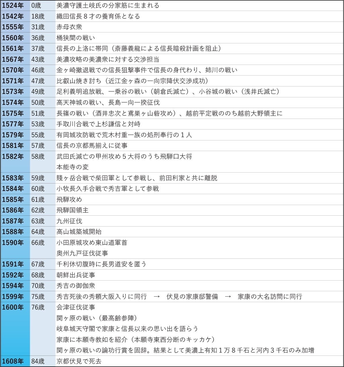 今年で生誕500年ということは1524年生まれです。今川義元の5歳下、武田信玄の3歳下。上杉謙信の6歳上、織田信長の10歳上、豊臣秀吉の13歳上、徳川家康の18歳上です。亡くなったのは1608年84歳で、関ヶ原の戦いや江戸幕府成立後です。信長が今川義元を討ち取った桶狭間の戦いに参戦し、天下分け目の関ヶ原の戦いにも参戦した唯一の武将となるほど第一線での活動期間が長いです。