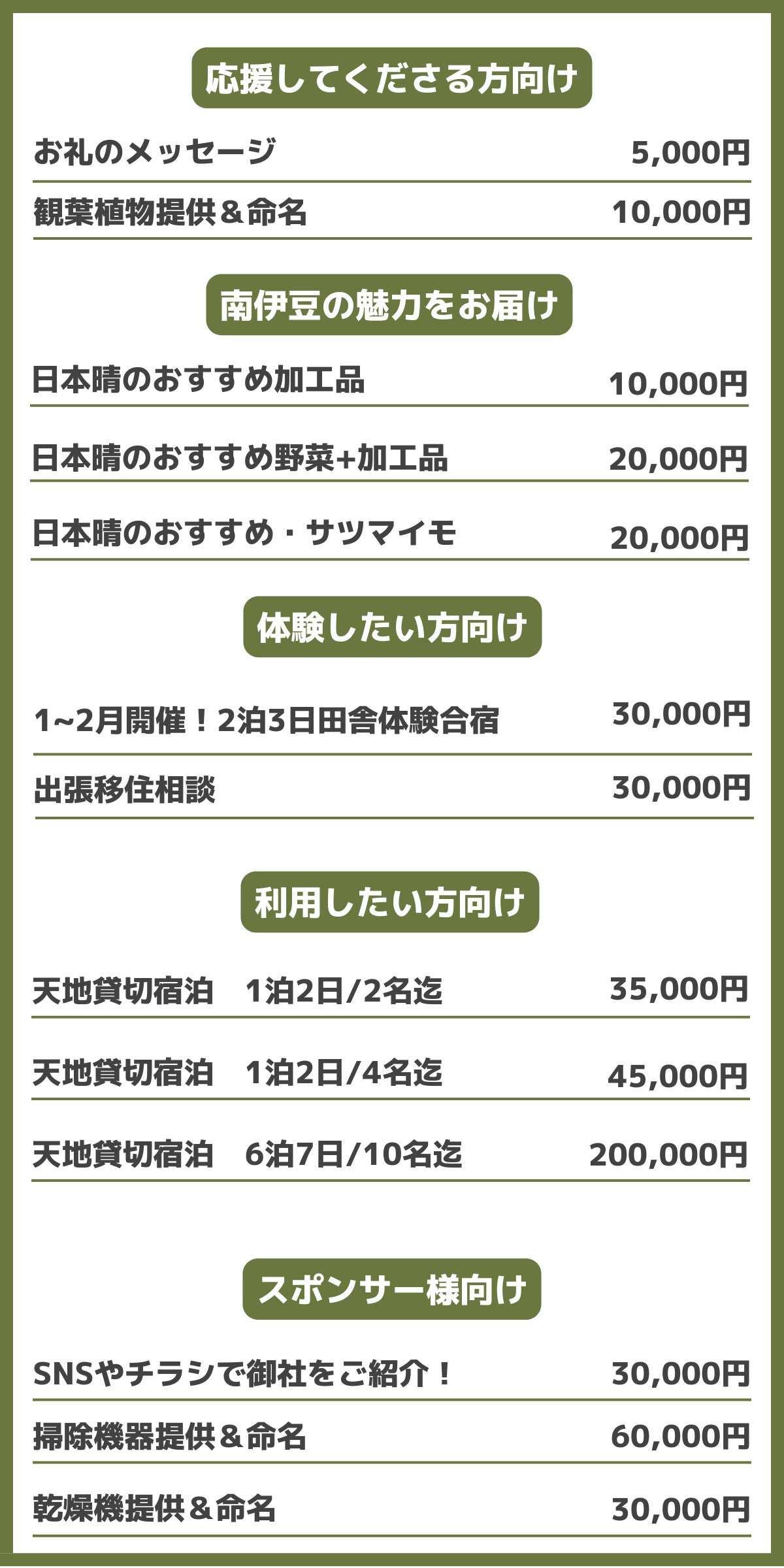 今回、クラウドファンディング限定の宿泊リターン、また遠方の方で天地にお越しになることが難しい方に向けた南伊豆の魅力をご自宅で体験できる配送のリターンをご用意致しました!