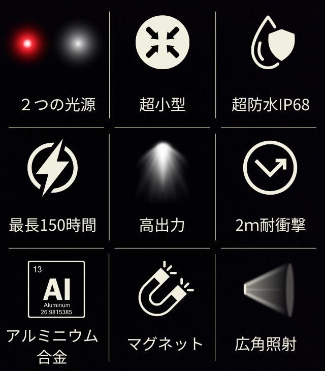 約6cmという圧倒的コンパクトサイズながら、1200(ルーメン)×110mの超高光度ユニットを備えたLED懐中電灯。マグネットや専用クリップを装備しているため活用範囲も広い。