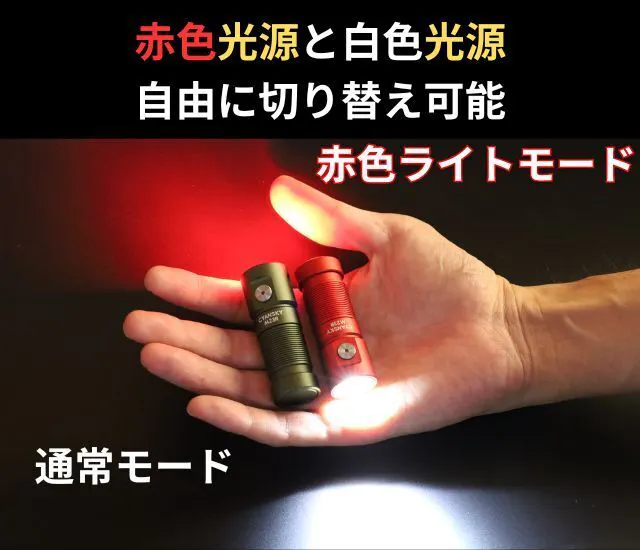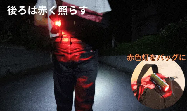 赤ライトモードの赤い光は、散乱しづらく、周りから見やすい。