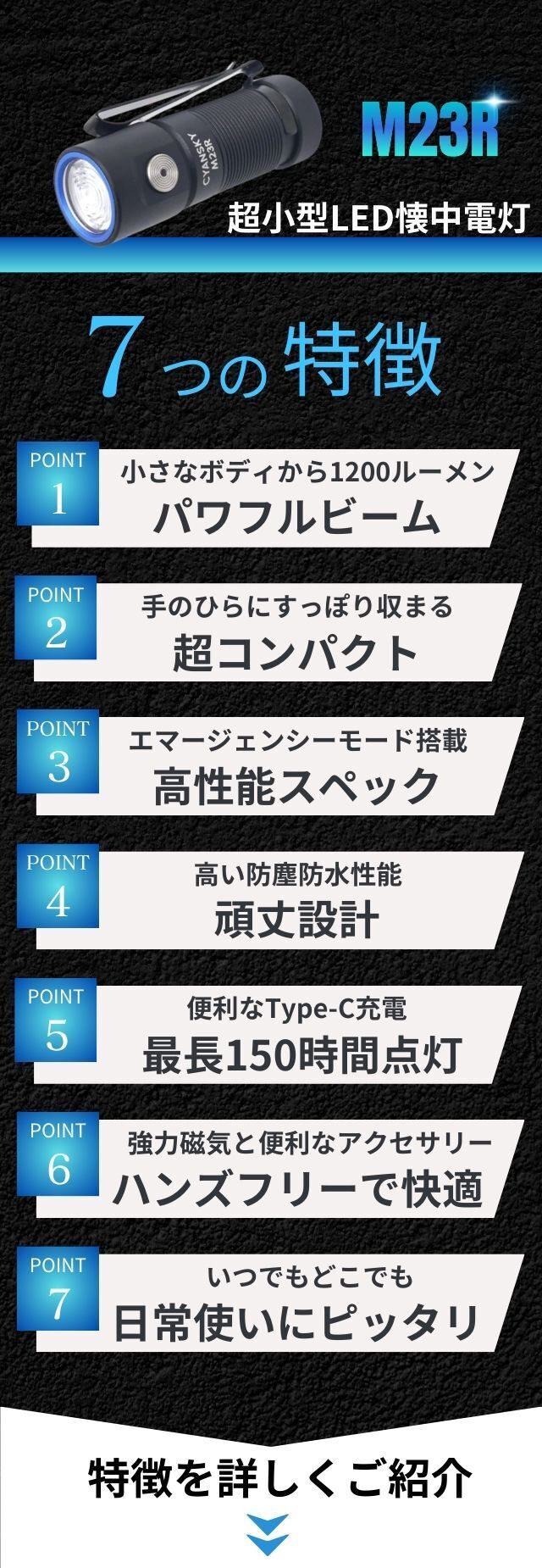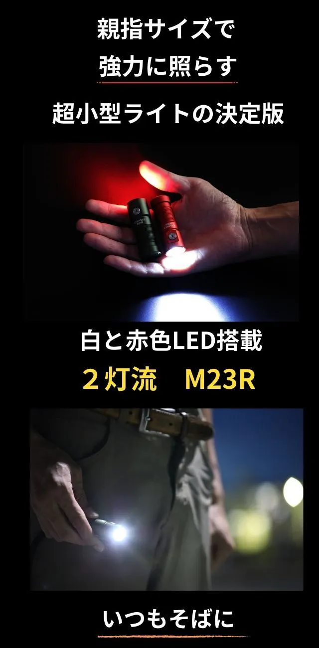 『M23R』は1回の充電で長く点灯できるように極小サイズの中でも圧倒的な長時間設計を実現。