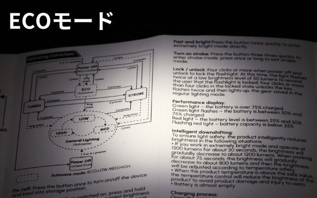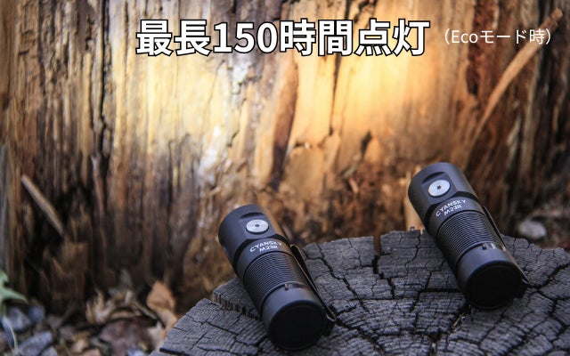Ecoモードは、夜間など手元で小さな明かりがほしいときにとても役立ちます。最大150時間の連続点灯が可能なため、停電や緊急時にも役立ちます。