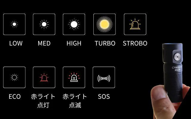 LOW:25ルーメン MED:120ルーメン HIGH:350ルーメン