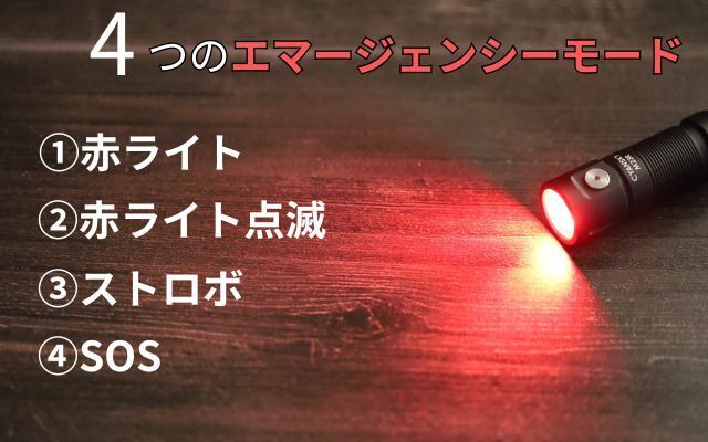 SOSモードは、言語を問わず共通で使用できる救難要請信号。非常時に遠くに知らせる十分な120ルーメンの明るさ(4000Kは100ルーメン)。
