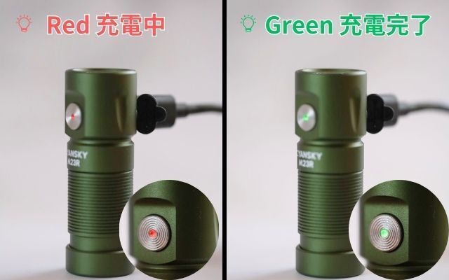 充電中は赤色が点灯、充電完了は緑色に変わるのでわかりやすい。