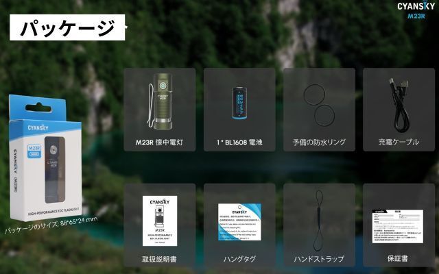 ●内容:M23R本体、 専用クリップ、リチウムイオン充電池、USB-Cケーブル、調節式ストラップ、取換用Oリング、説明書、保証書