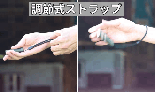 付属のストラップは、長さを簡単に調節できるので、持ったときの手首のフィット感をアップ。