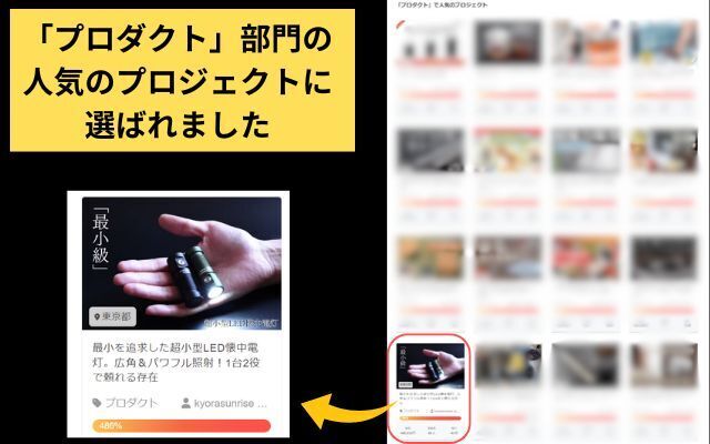 「最小を追求した超小型LED懐中電灯。広角&パワフル照射!1台2役で頼れる存在」ですが、おかげさまでプロダクト部門の【人気のプロジェクト】にランクインしています。