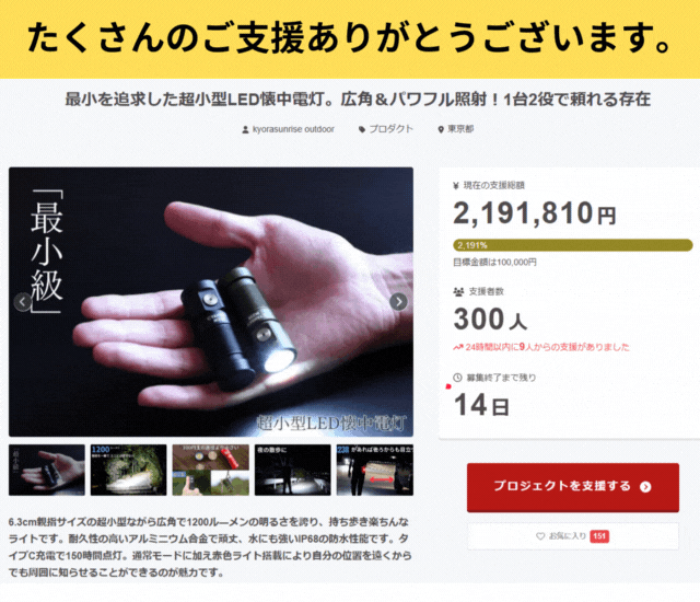 本プロジェクトも残り10時間となりました。「最小を追求した超小型LED懐中電灯。広角&パワフル照射!1台2役で頼れる存在」おかげさまで多く皆さまに応援していただきメーカー共々大変感謝しております。本当にありがとうございます。6.3cmと超小型な懐中電灯ですが、ただ小さいだけのものではなく、明るさにもこだわり、エコモードからターボモードは1200ルーメンの明るさがあり、日常使いにはピッタリ。また赤ライトの装備しているため、非常時にその力を発揮します。まだチェックされていない方は、ページを覗いてみてくださいね。https://camp-fire.jp/projects/775556/viewよろしくお願いいたします。