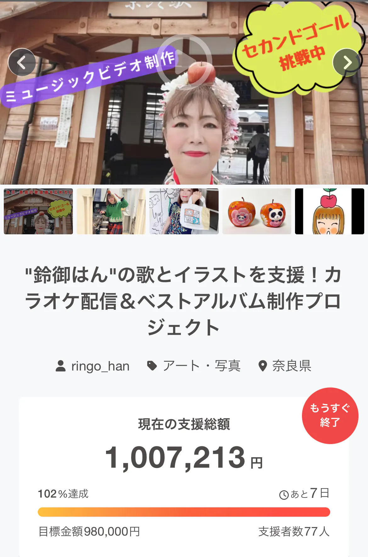 地元・京終の人だけでなく、奈良好き、歌謡曲好きのみなさんに歌っていただきたいです。あたたかい応援とご支援を求めます。セカンドゴール達成のため、どうぞよろしくお願いいたします!