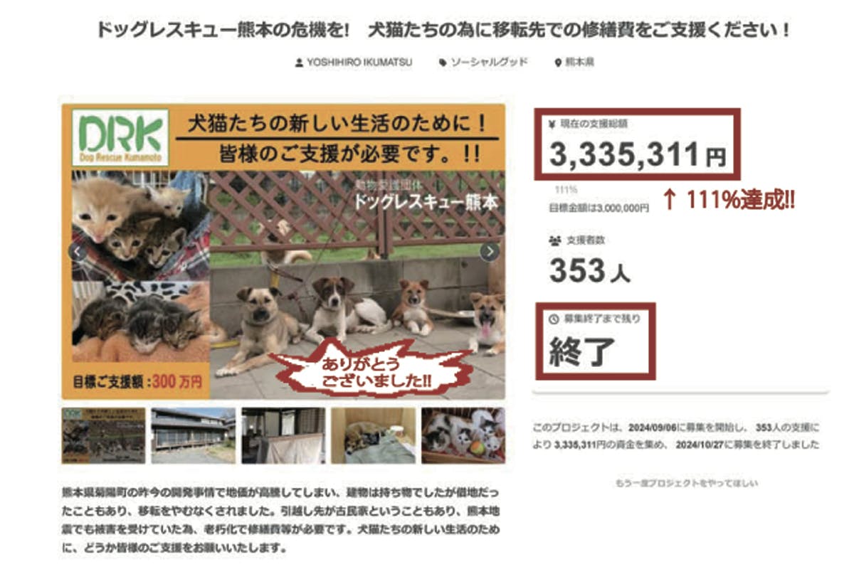 2024/10/28 12:40ドッグレスキュー熊本 代表の生松義浩です。昨日にて、当クラウドファンディングが終了いたしました。皆様のご支援とご協力ののおかげで、目標を達成することが出来ましたこと深く感謝申し上げます。本来であれば直接お会いして御礼を申し上げるべきところですが、大変恐縮でございますが、メールにて失礼させていただきます。本当にありがとうございました。 もっと見る