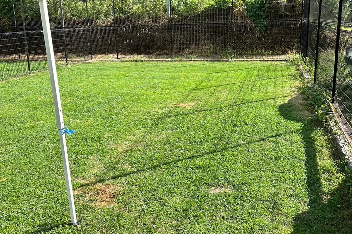 ドッグレスキュー熊本の生松です。以前完成していた芝生のドッグランですが、今年の厳しい暑さで日中はおろか夕方も中々芝刈りが出来ずにいましたが、今日は、昼から曇り始めたので、急いで芝刈りを始めたところ、急にどしゃ降りになってしまい中断。3時間ほどたって雨が止んだので、また急いで芝刈りをはじめ、やっと片面の芝刈りが終えました。